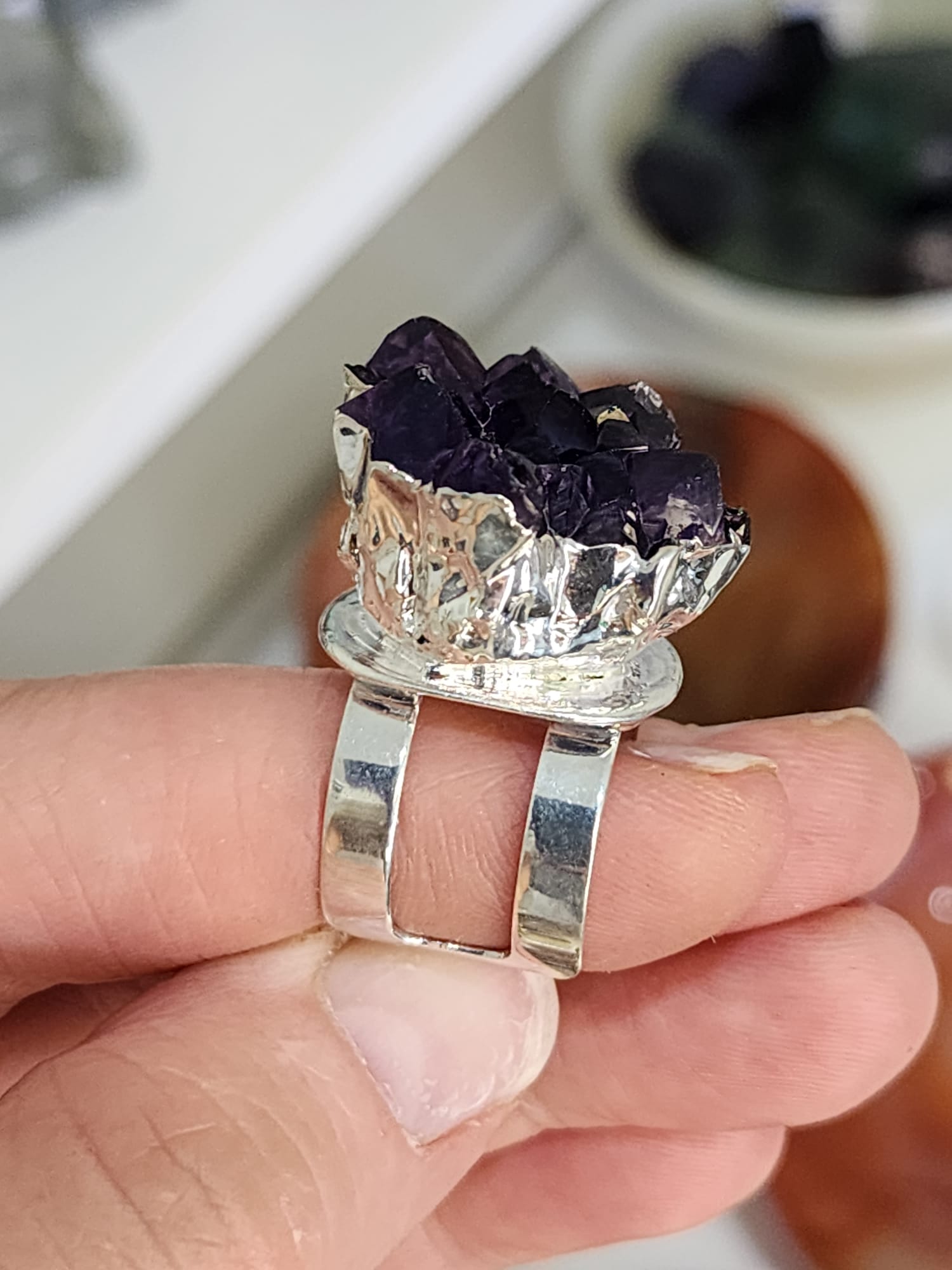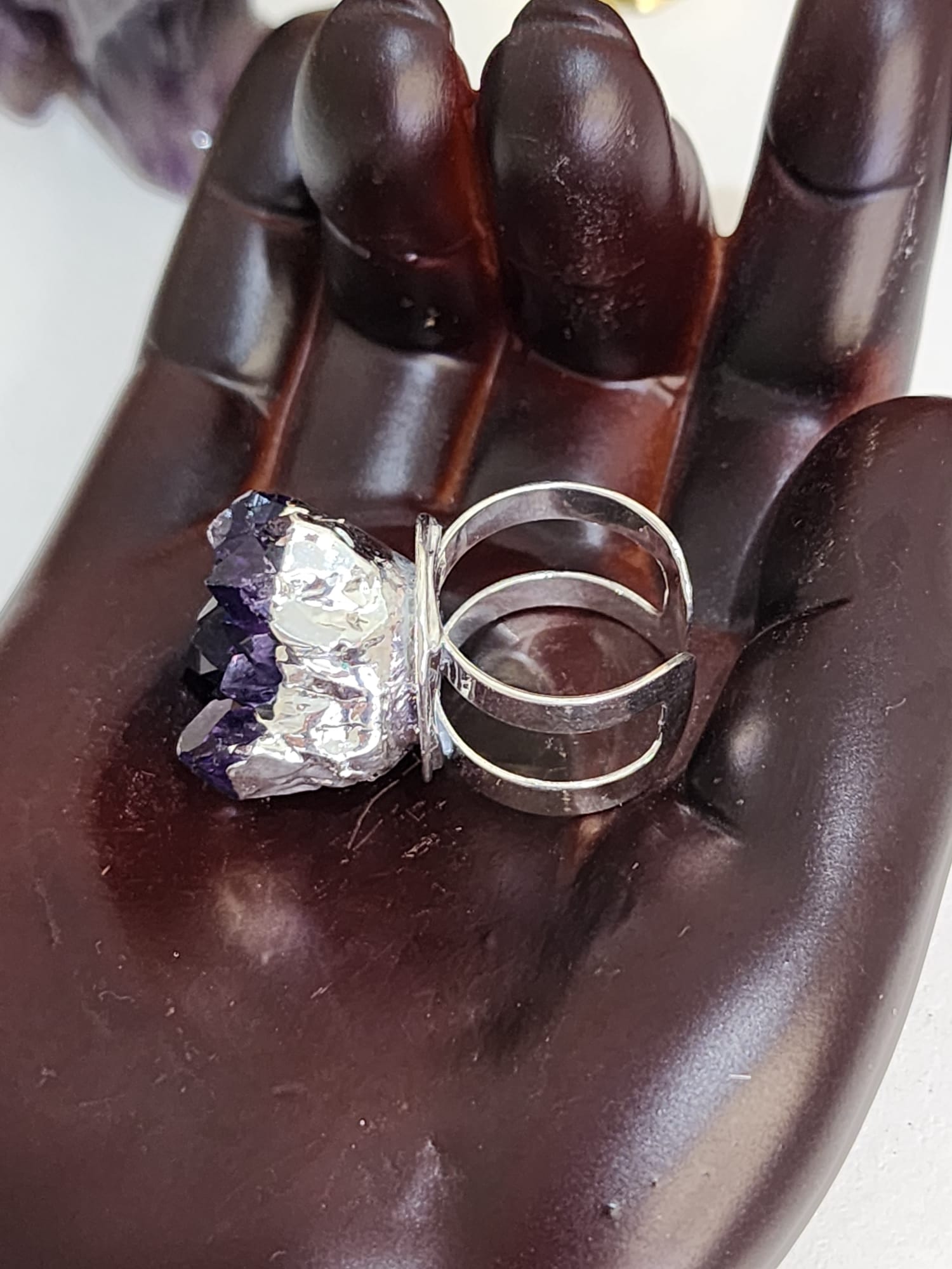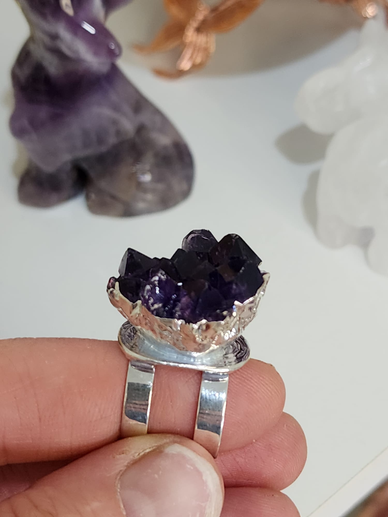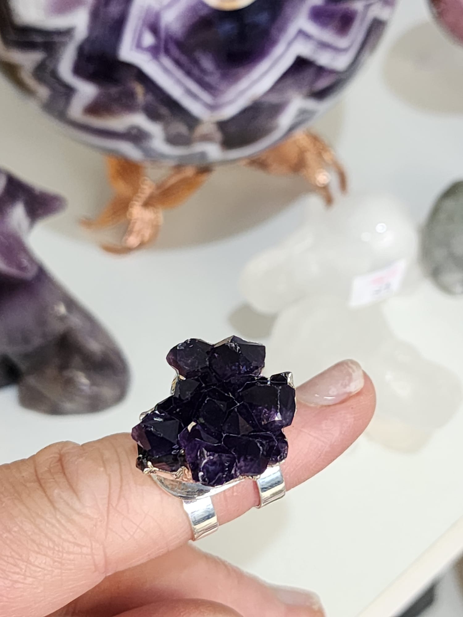 Amethyst Cluster Ring Introducing our stunning Amethyst Cluster Ring! This exquisite piece features a cluster of amethyst gemstones, exuding elegance and luxury. Perfect for adding a touch of sophistication to any outfit. Elevate your style and feel empowered with this beautiful and unique ring!