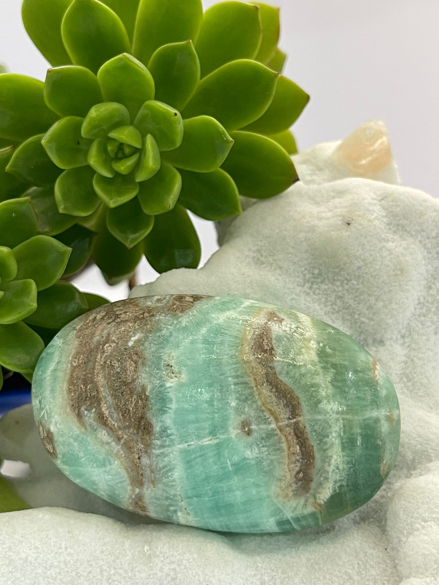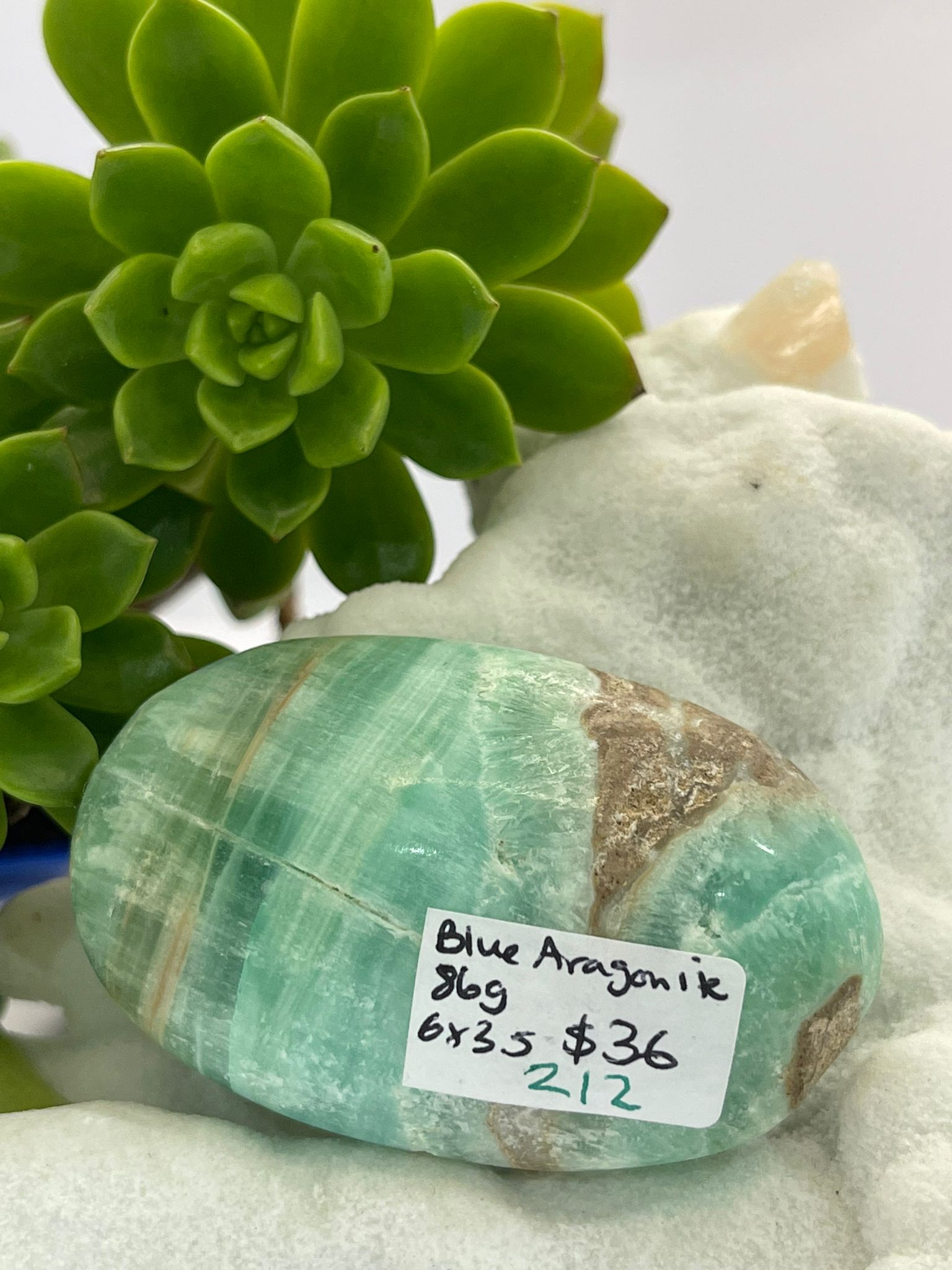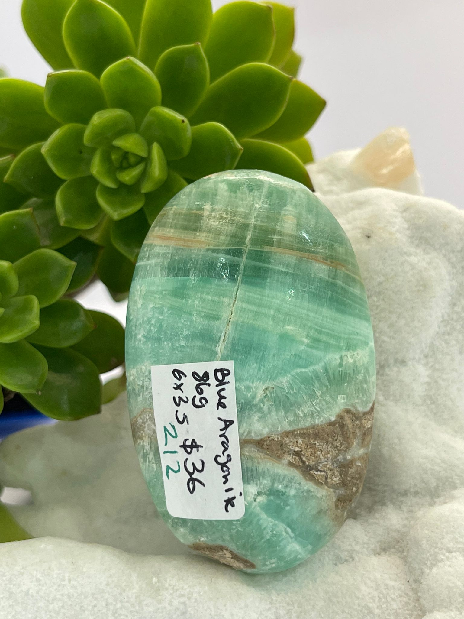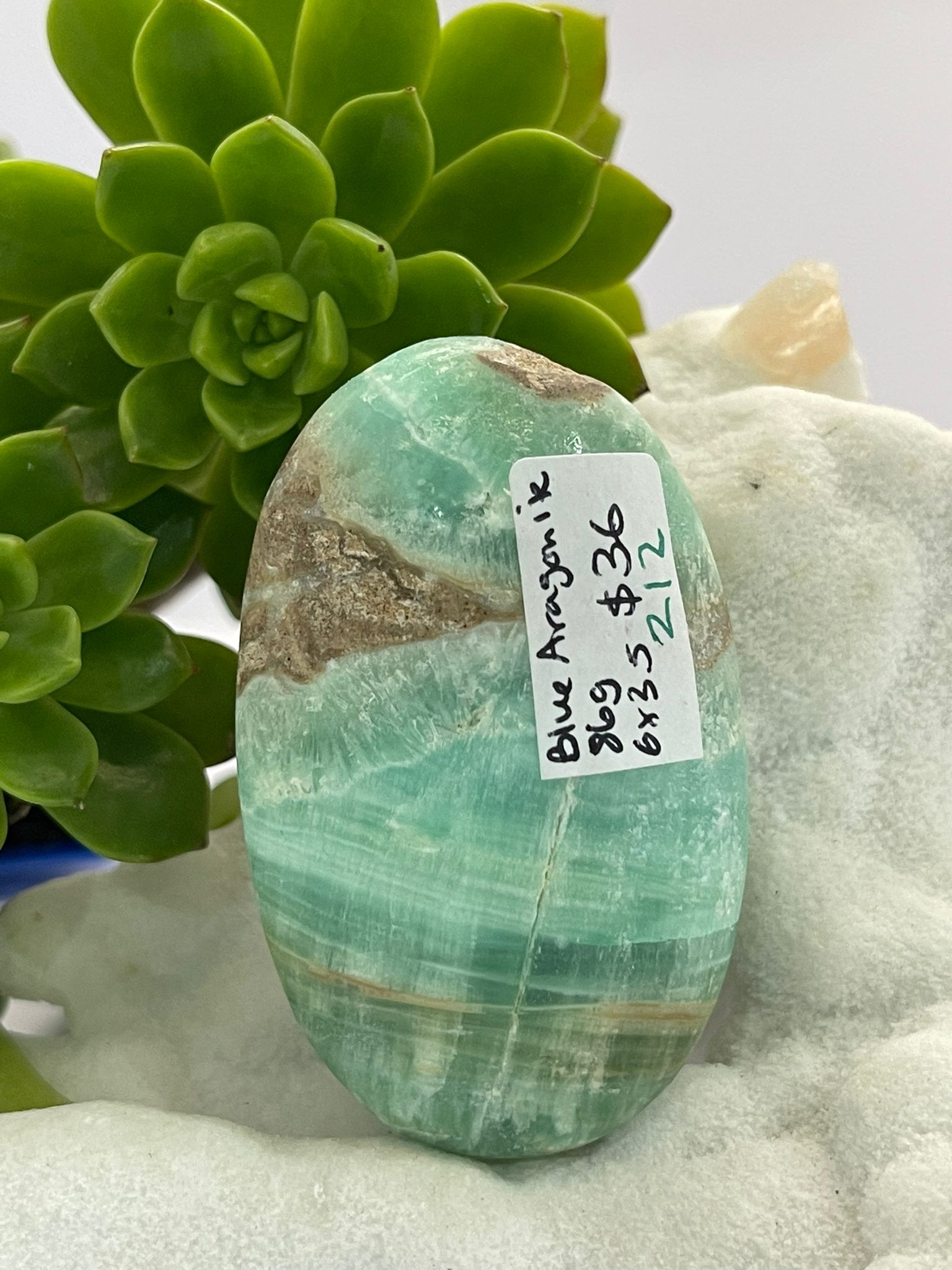 Blue Aragonite A Grade Palm stones are prized for their calming energy, emotional healing properties, and ability to enhance communication and spiritual insight. They're especially popular in meditation, energy work, and altar setups due to their soothing aqua hue and metaphysical versatility.