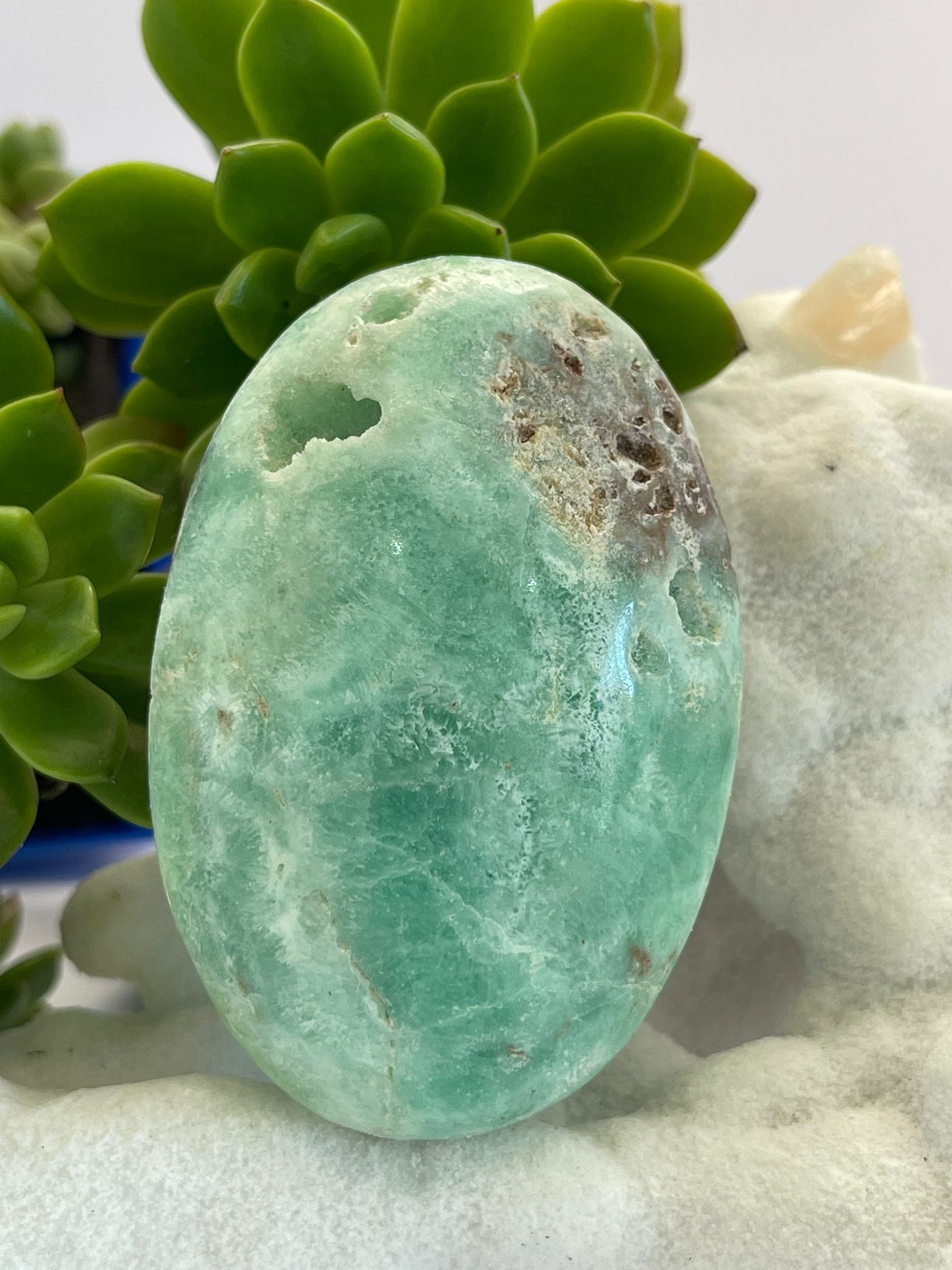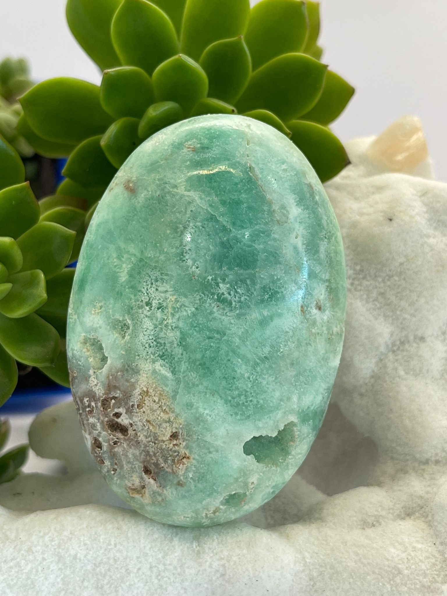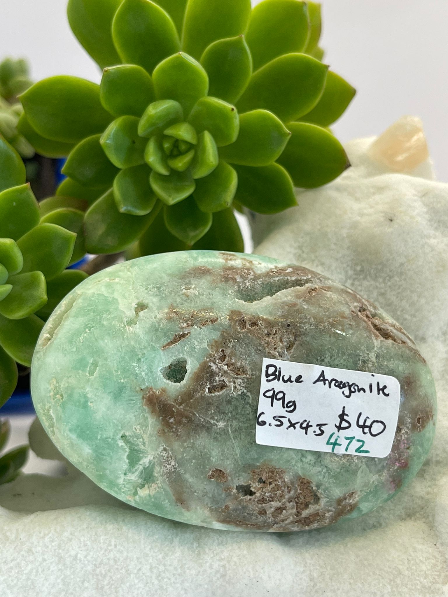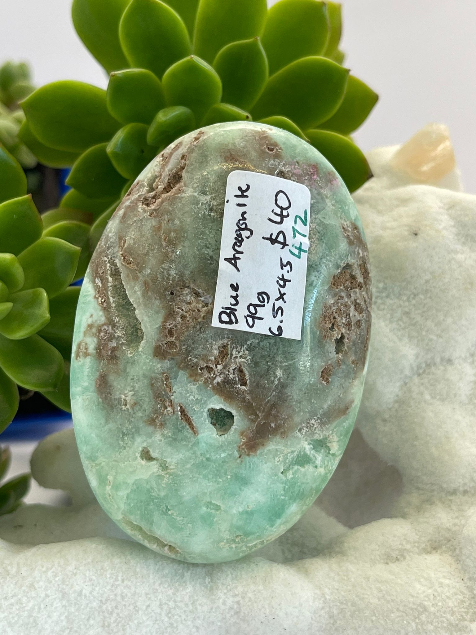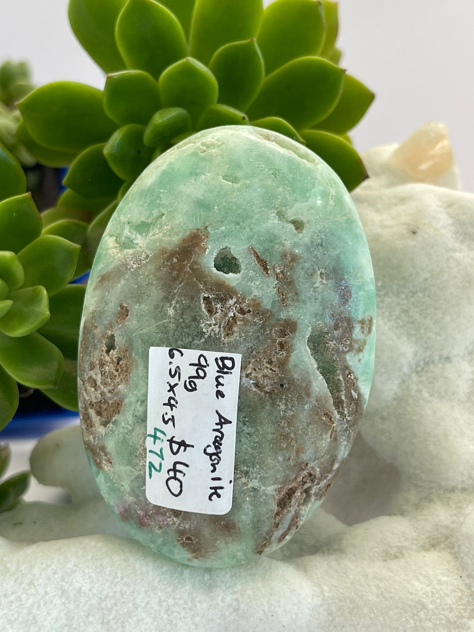 Blue Aragonite A Grade Palm stones are prized for their calming energy, emotional healing properties, and ability to enhance communication and spiritual insight. They're especially popular in meditation, energy work, and altar setups due to their soothing aqua hue and metaphysical versatility.