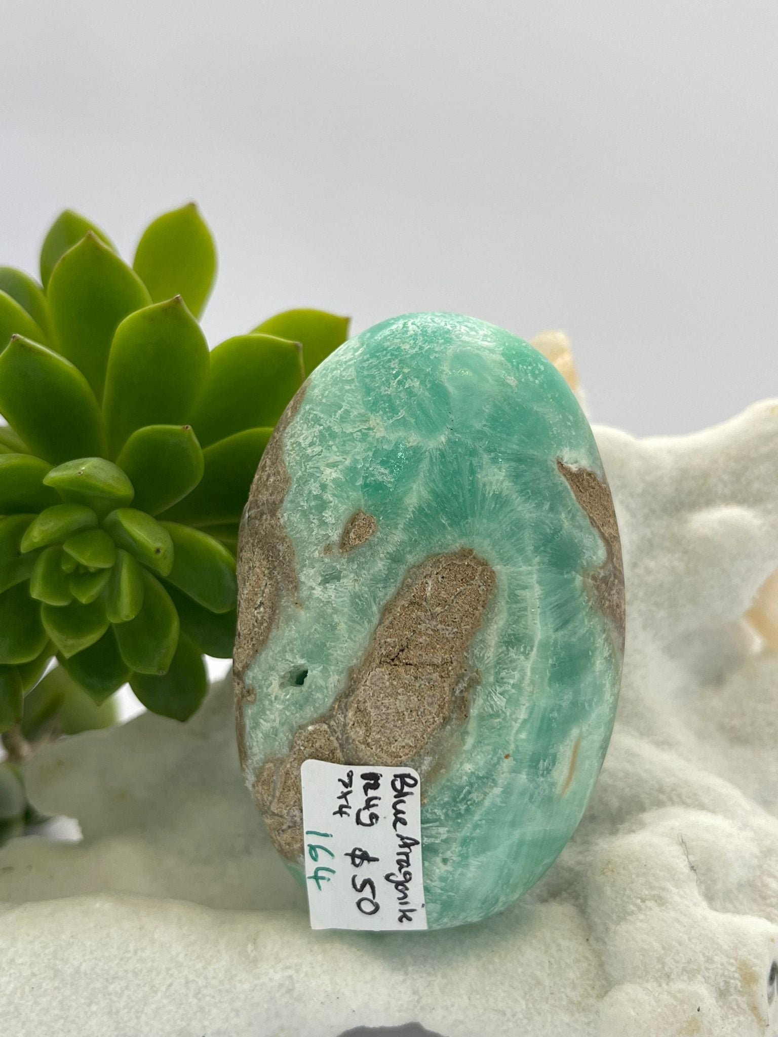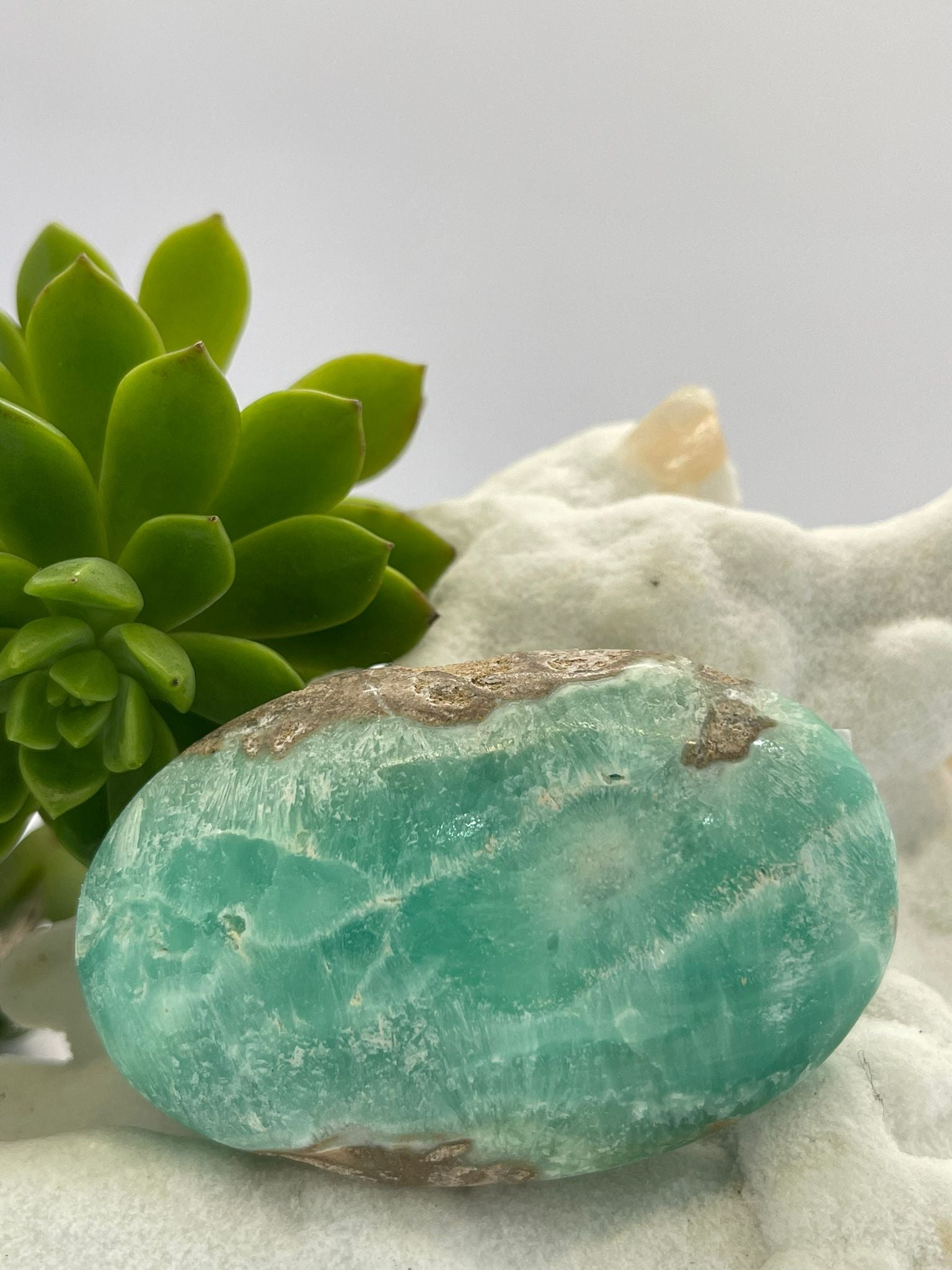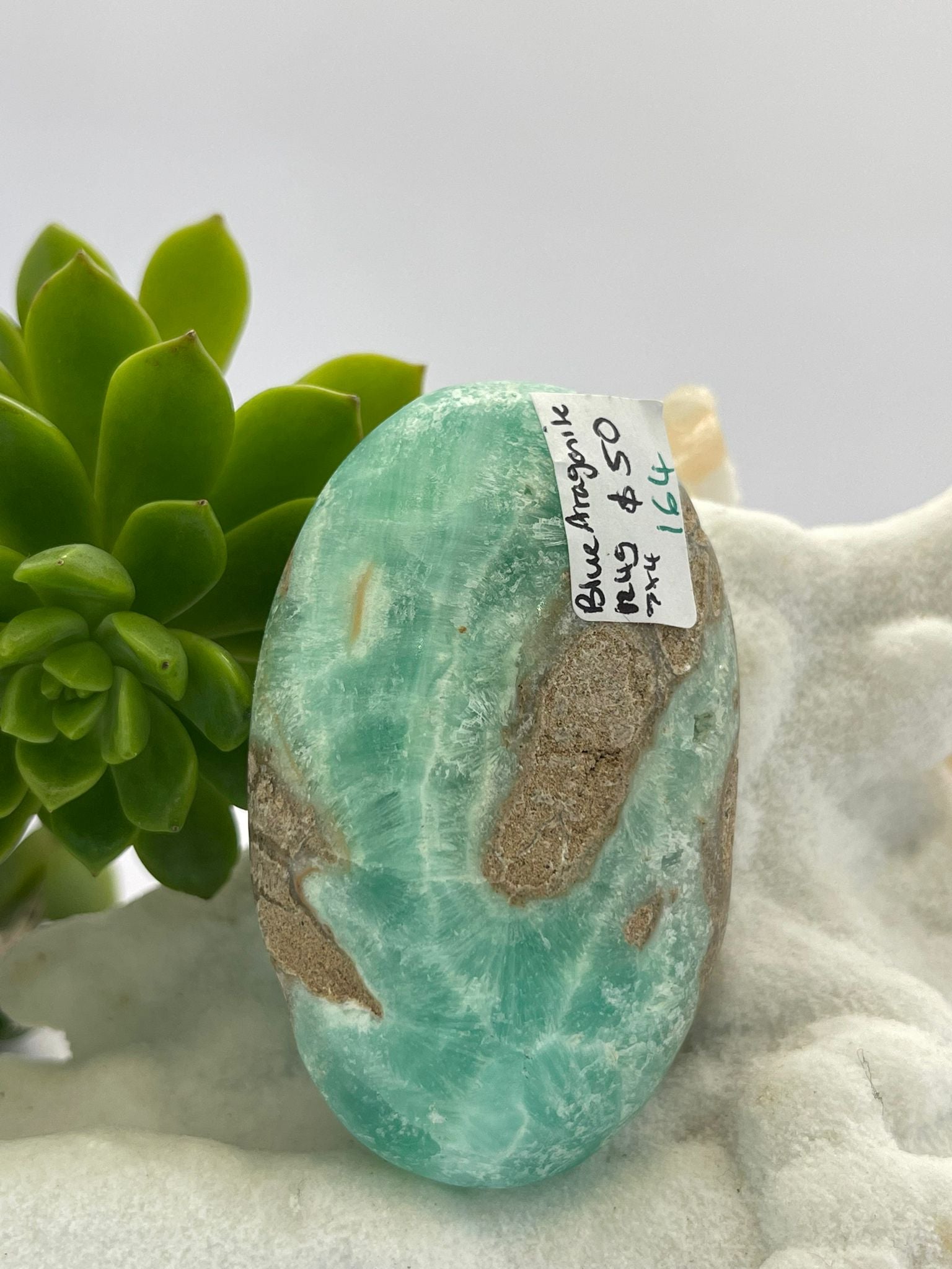Blue Aragonite A Grade Palm stones are prized for their calming energy, emotional healing properties, and ability to enhance communication and spiritual insight. They're especially popular in meditation, energy work, and altar setups due to their soothing aqua hue and metaphysical versatility.