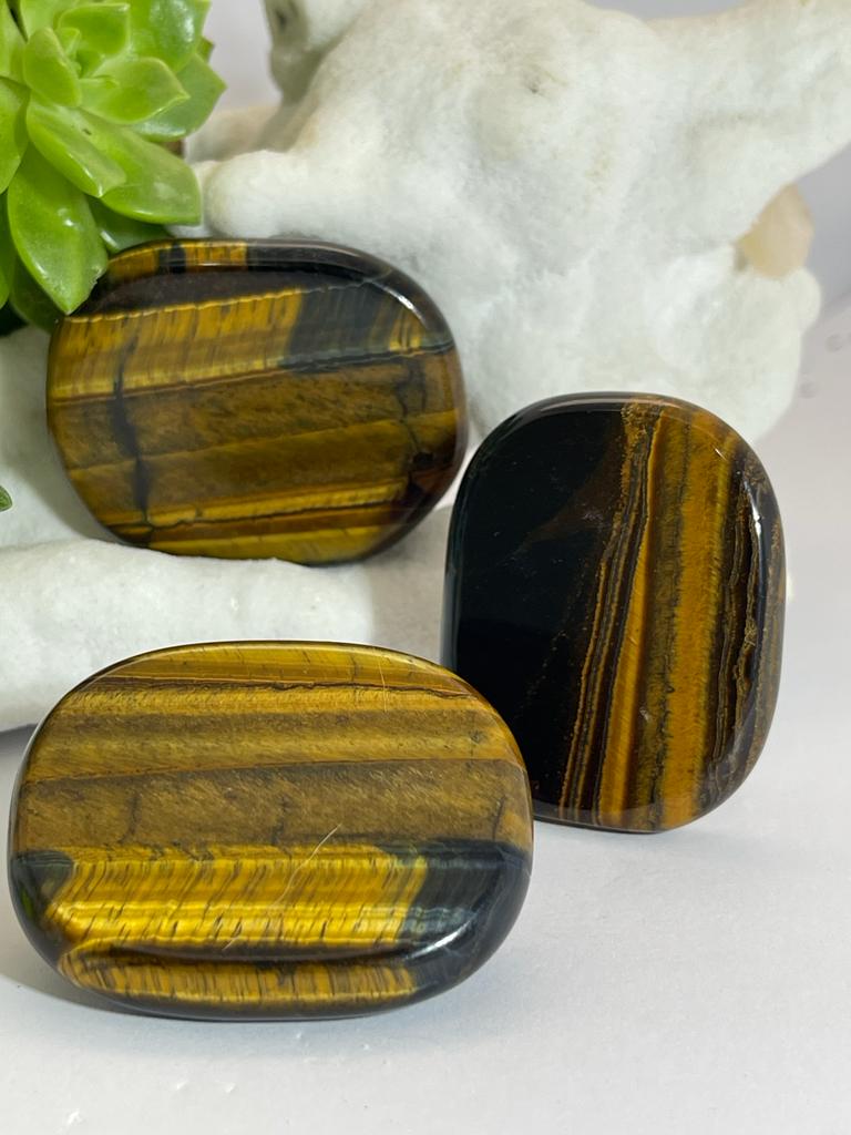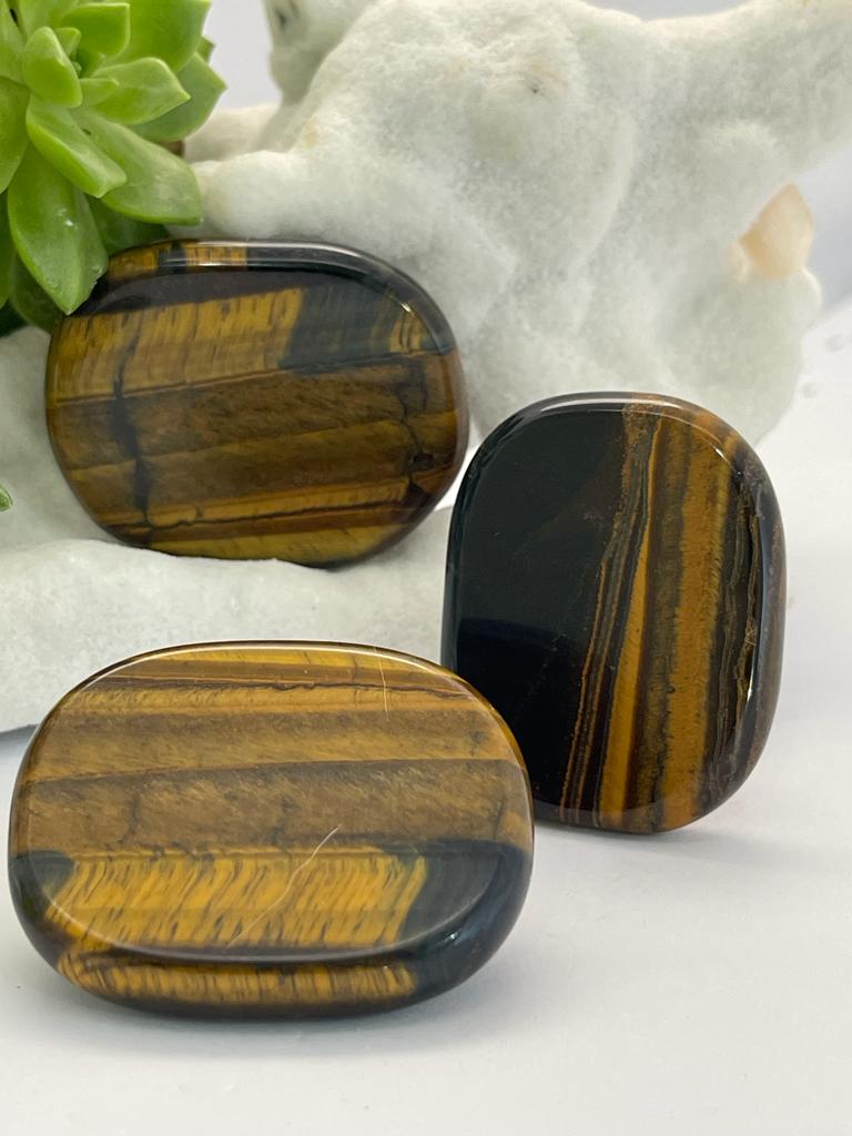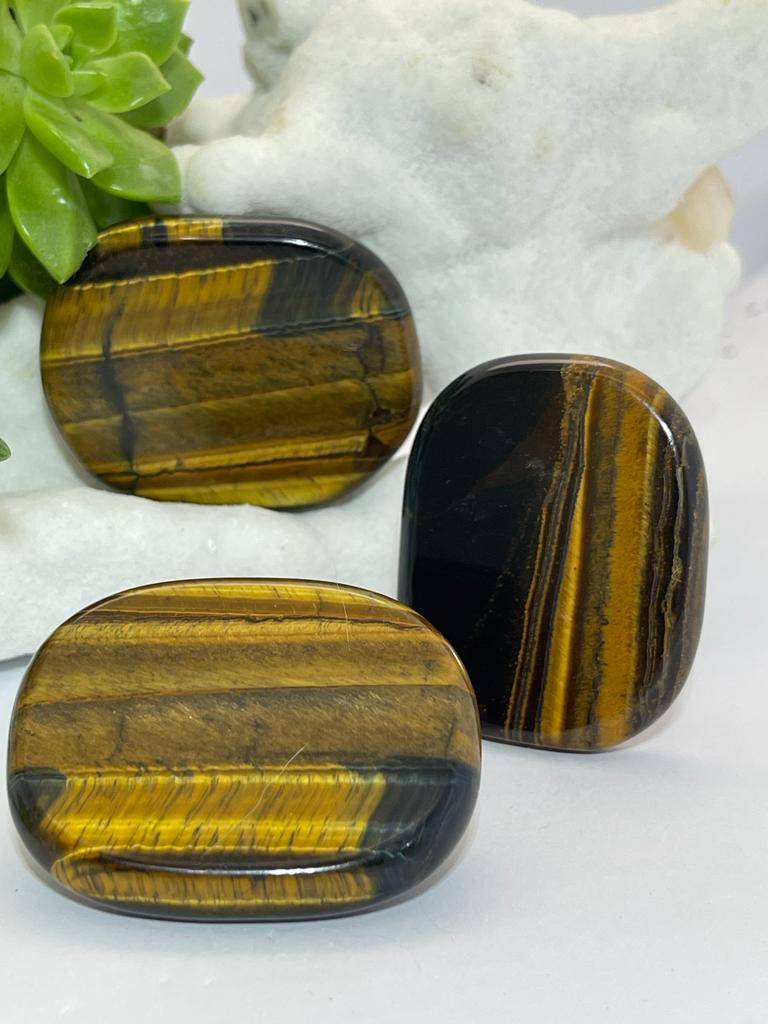 These polished thumb stones radiate with golden-brown chatoyancy, flashing bands of caramel, amber, and espresso tones as they catch the light. Smooth and tactile, they’re perfect for grounding moments and intentional touch.