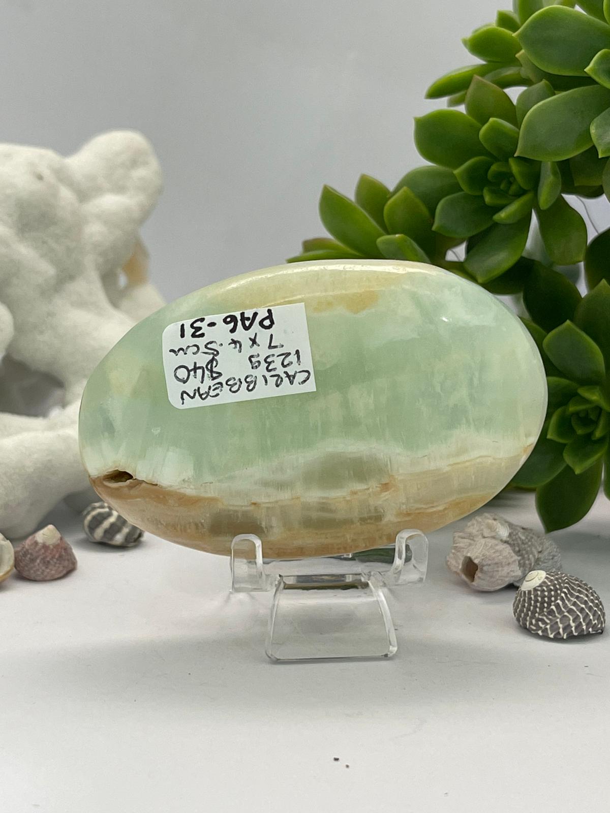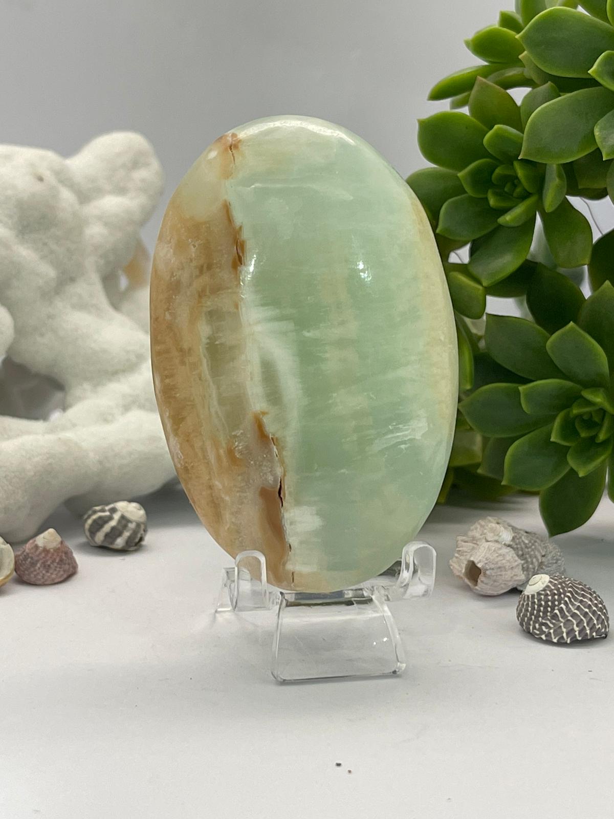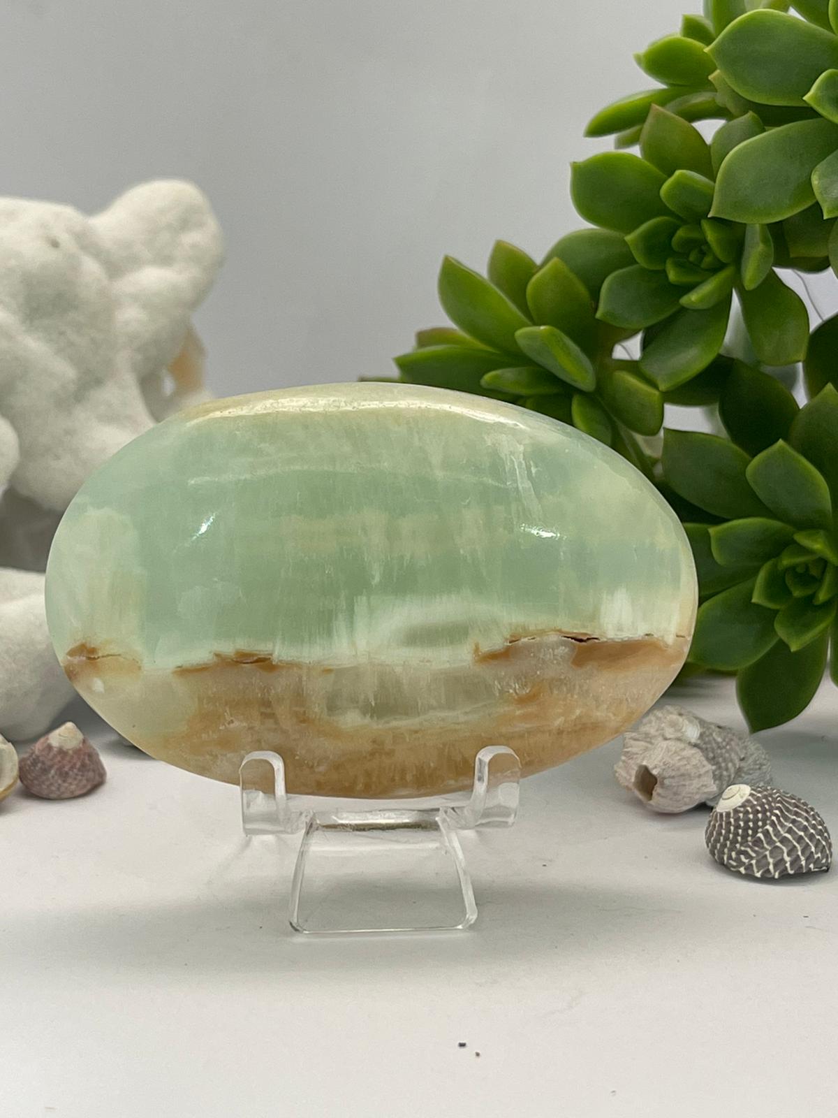 Caribbean Blue Calcite palm stones are beloved for their tranquil energy, emotional healing properties, and dreamy oceanic appearance. This relatively new crystal discovered in Pakistan in 2019, is a fusion of Blue Calcite and White/Brown Aragonite, making it both visually stunning and energetically versatile.