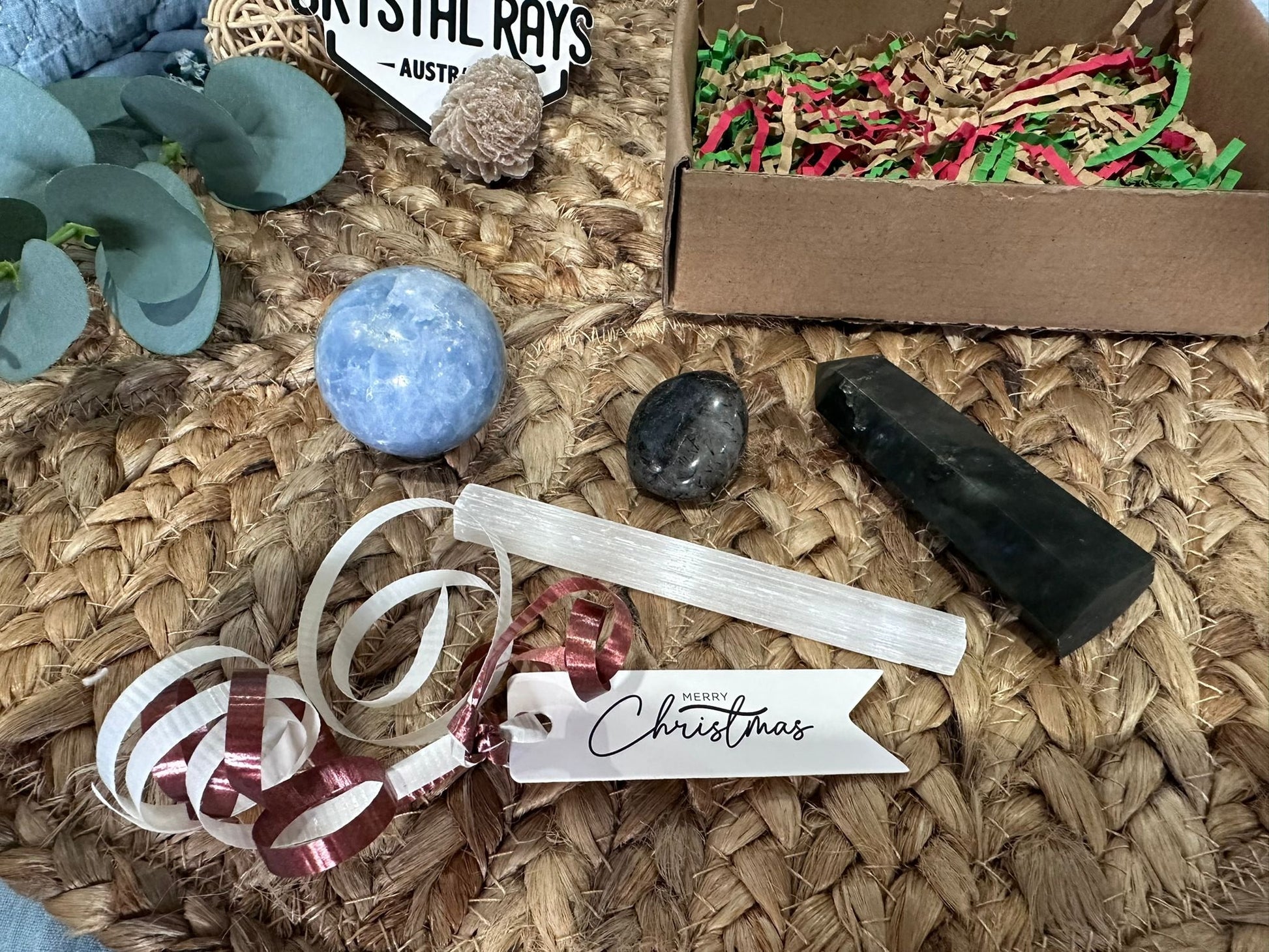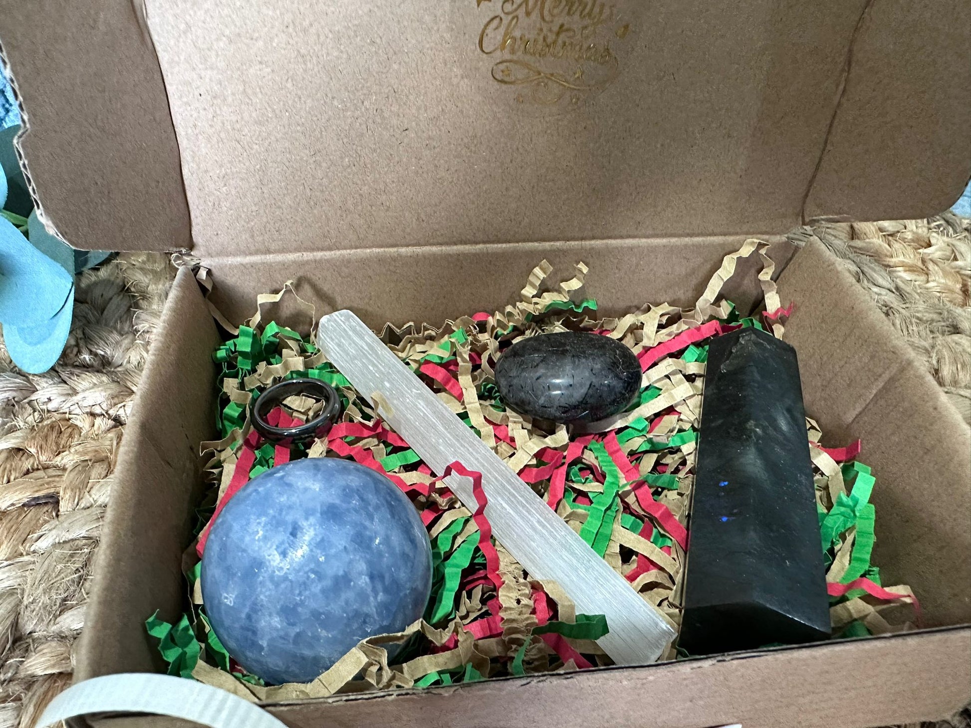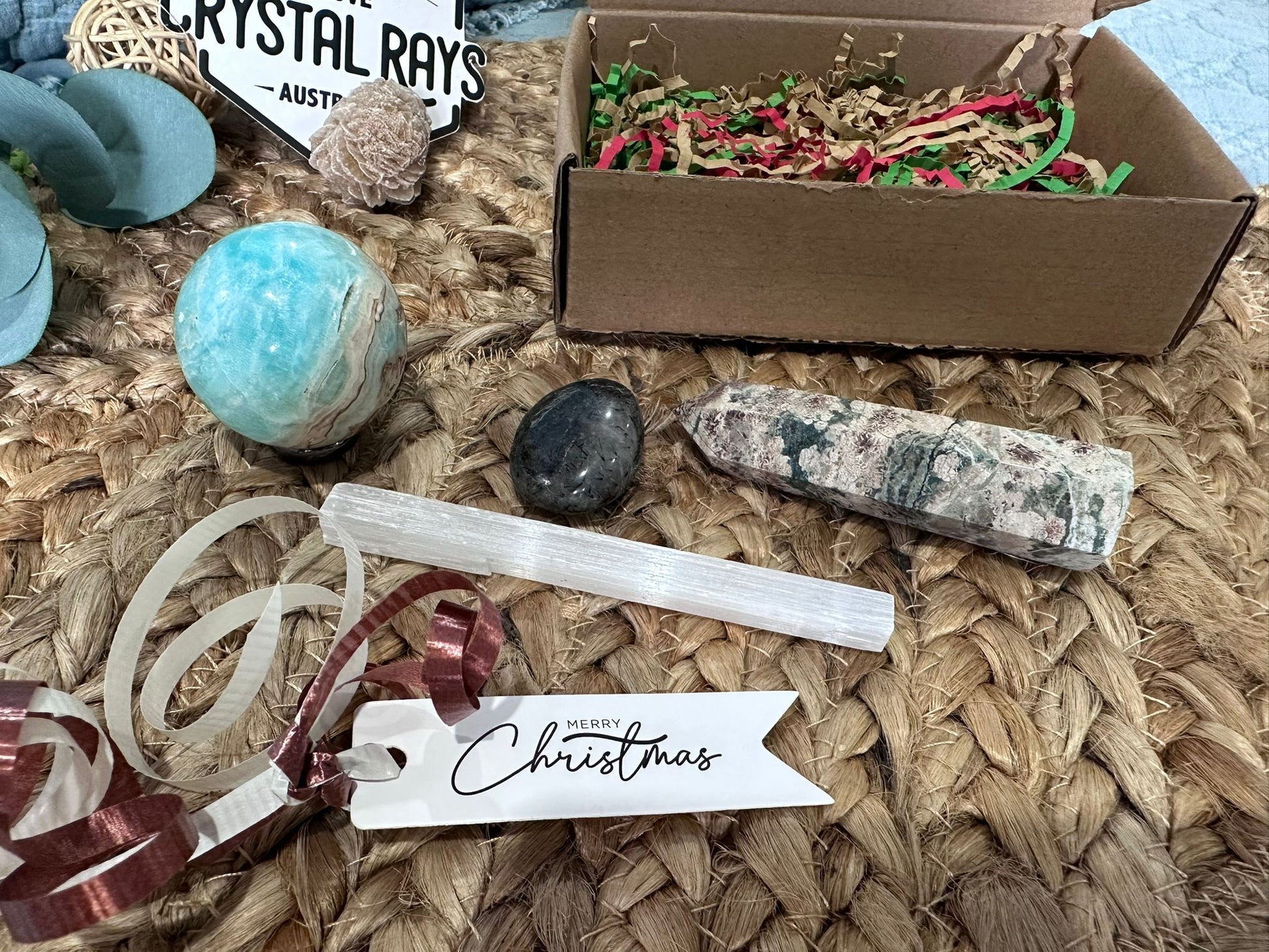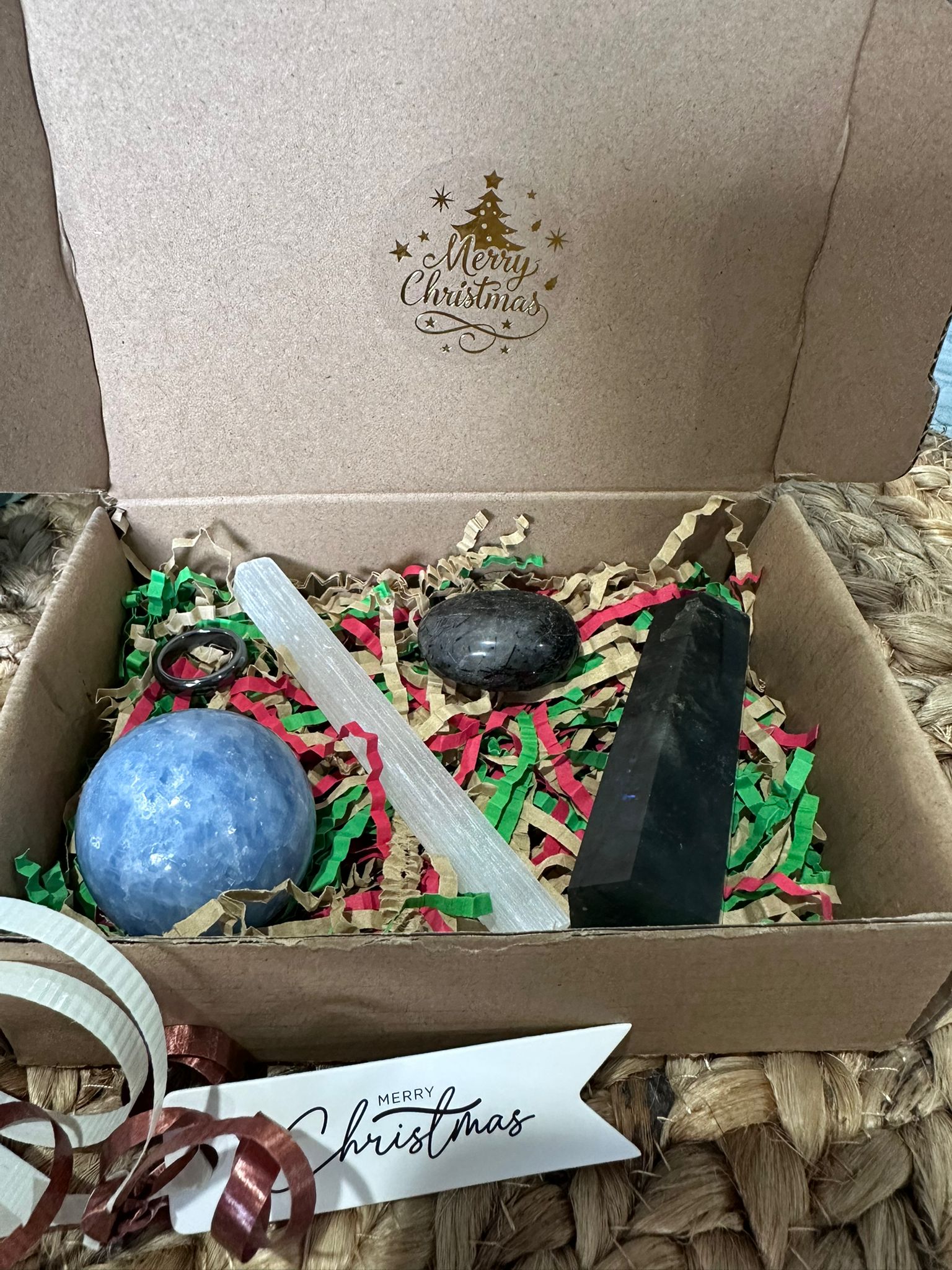 We offer two varieties of packs; each intuitively selected with the names of crystals included Each gift pack is presented in a box adorned with holiday season cheer.