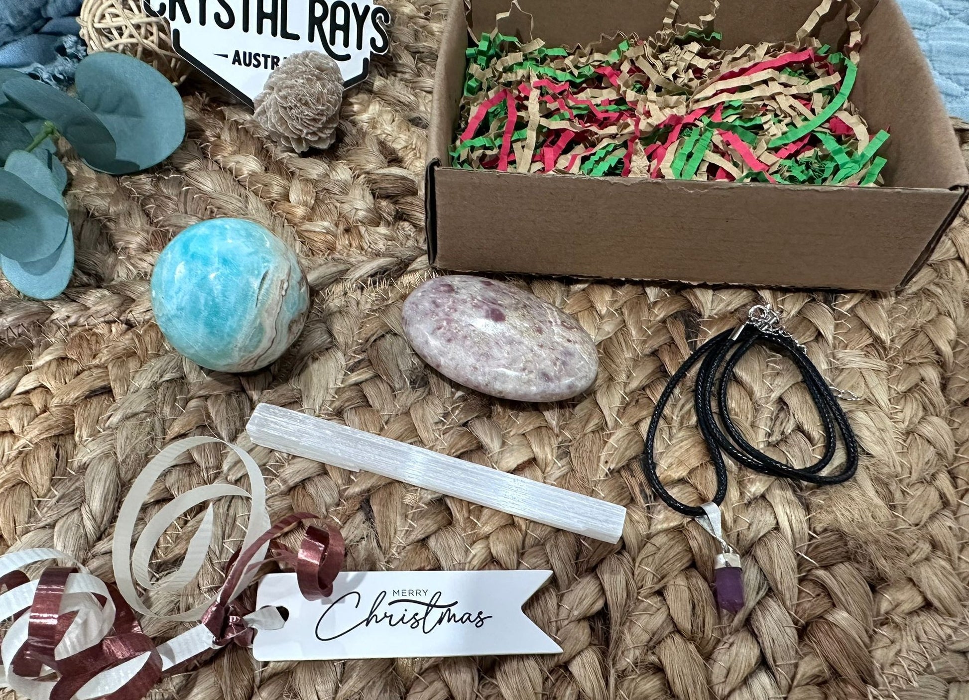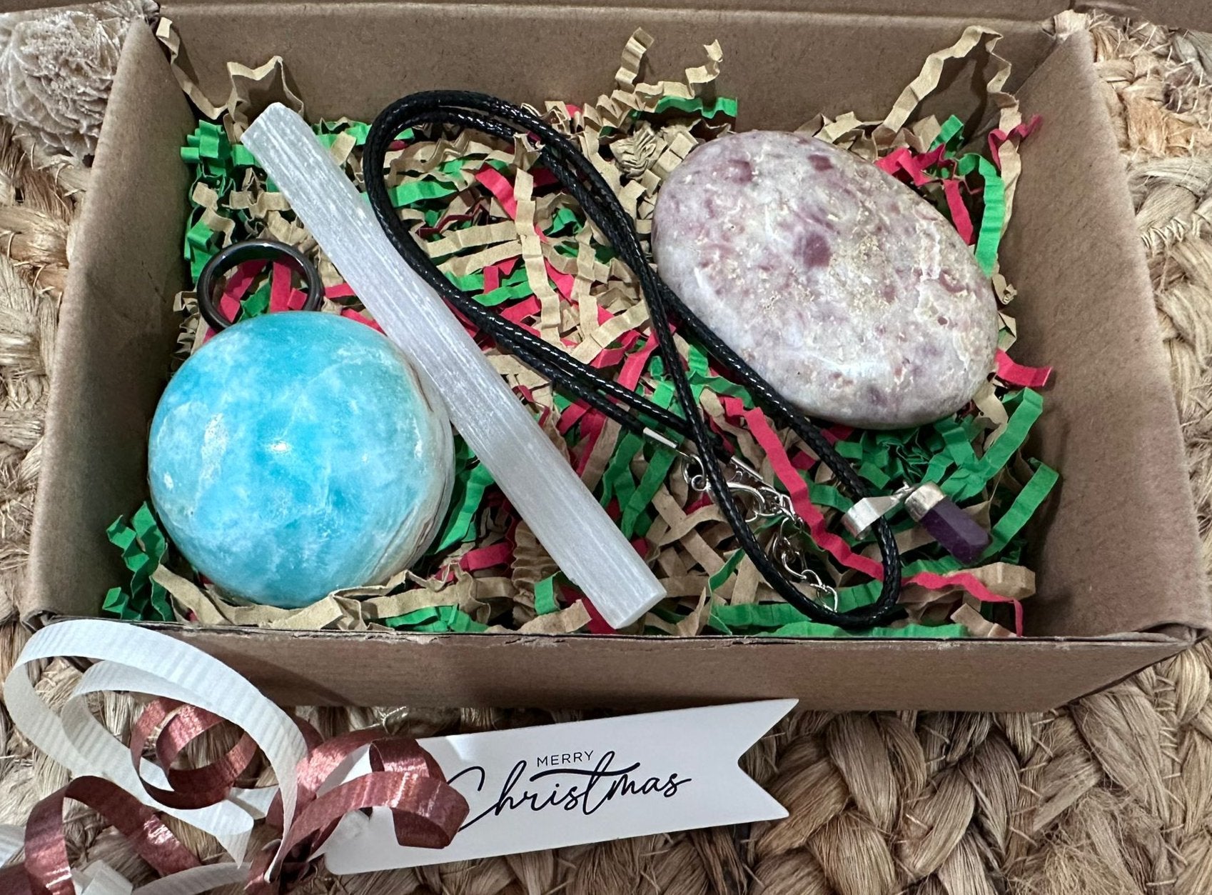 We offer two varieties of packs; each intuitively selected with the names of crystals included Each gift pack is presented in a box adorned with holiday season cheer.