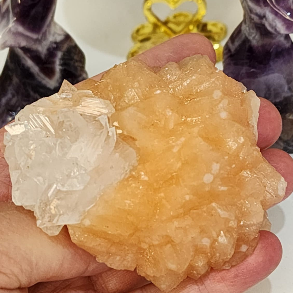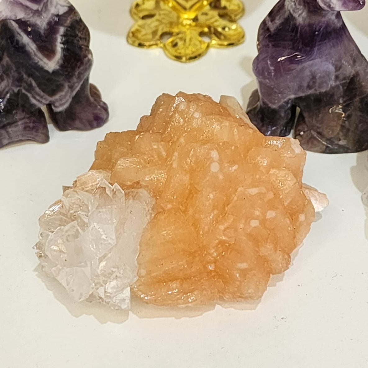 This duo is a metaphysical dream team—Stilbite and Apophyllite are often found together in radiant clusters, and their energies complement each other beautifully. Here's how each contributes to your spiritual toolkit: