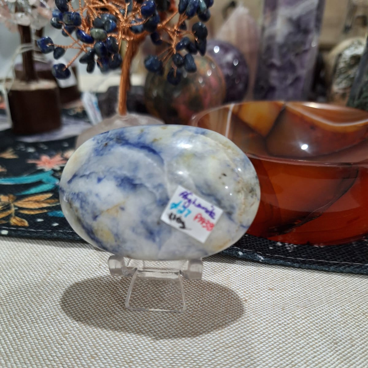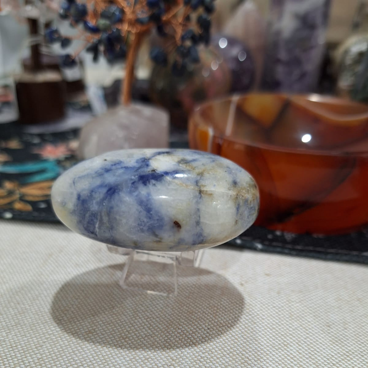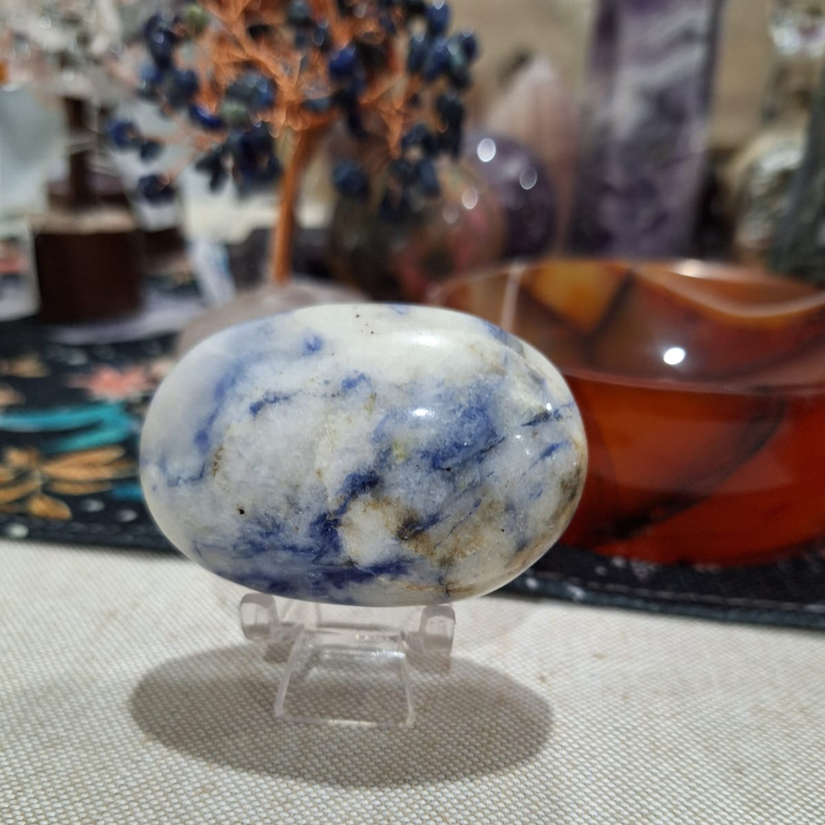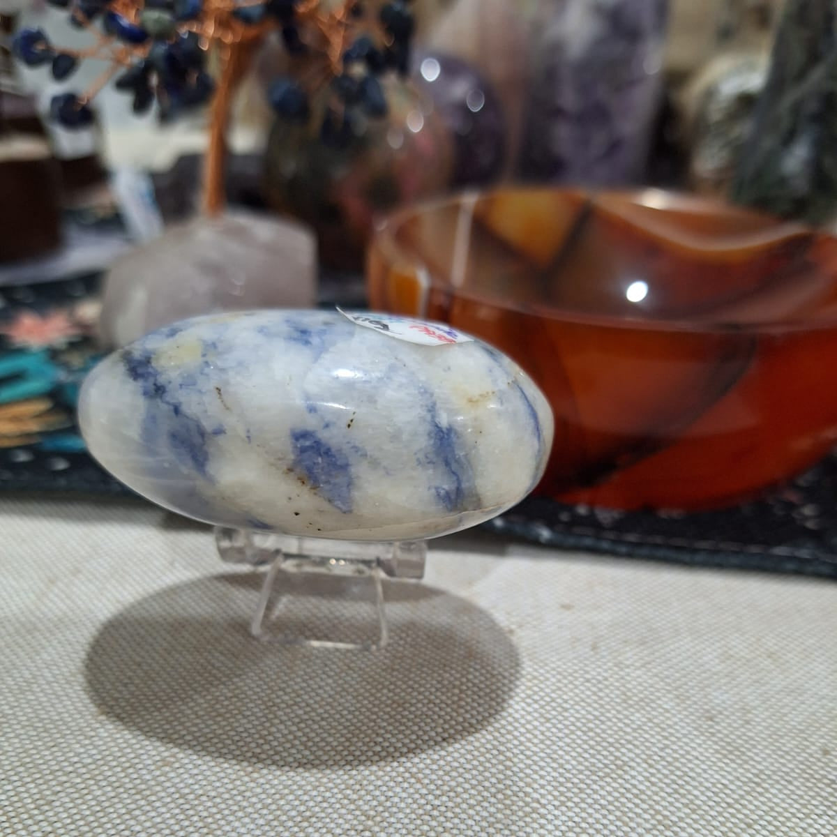 Afghanite Palm Stone 💙✨. These rare beauties showcase mesmerizing shades of deep to icy blue, often streaked with white or flecked with lazurite-like inclusions. Their smooth, oval shape makes them perfect for meditation, energy work, or simply holding during moments of reflection.