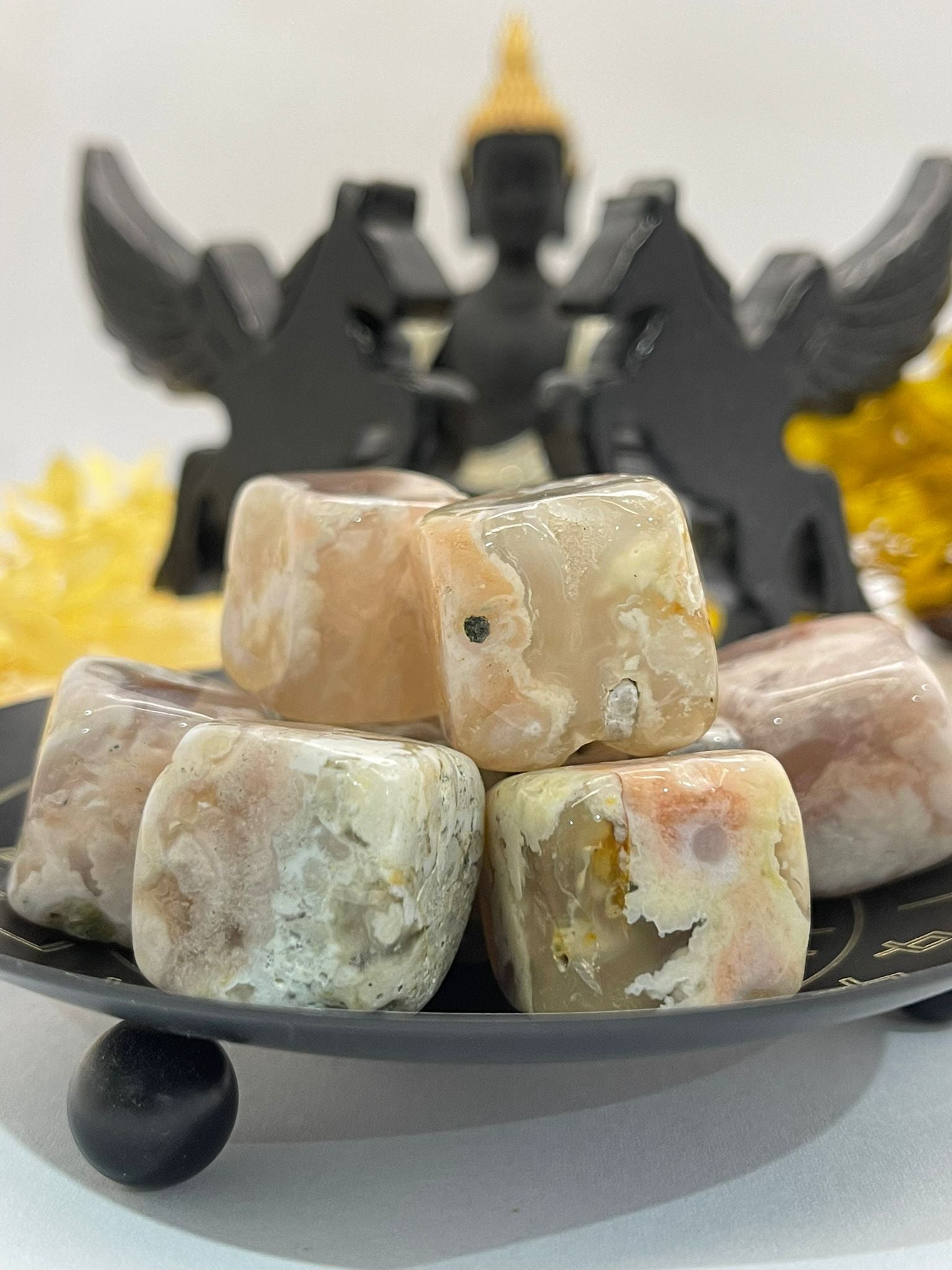 This stone exudes a gentle and nourishing energy, akin to a field of flowers. The circles and dots symbolize seeds, while the floral plumes symbolize blossoms, serving as a reminder that we begin as seeds and then bloom and grow. Flower Agate aids in visualizing the growth process, honouring and valuing every stage.