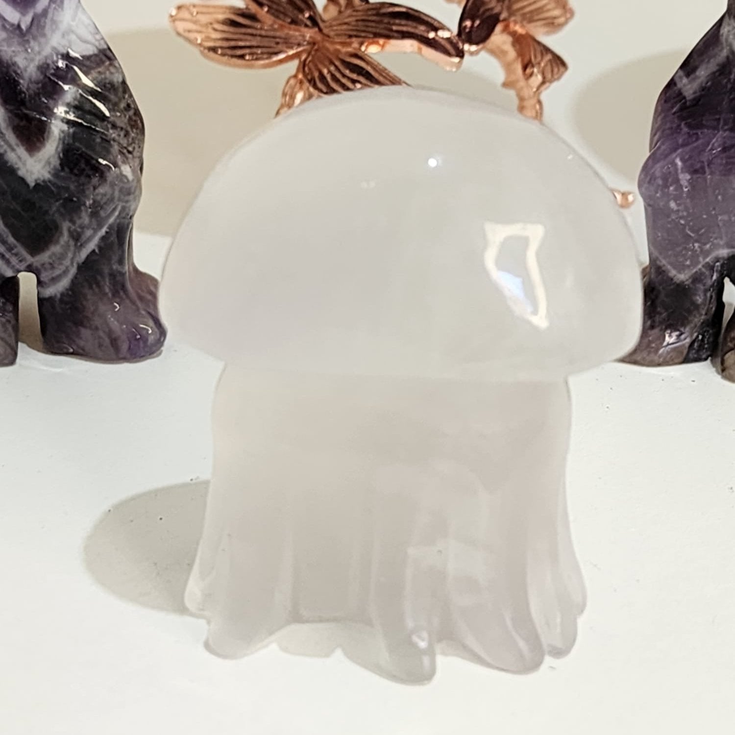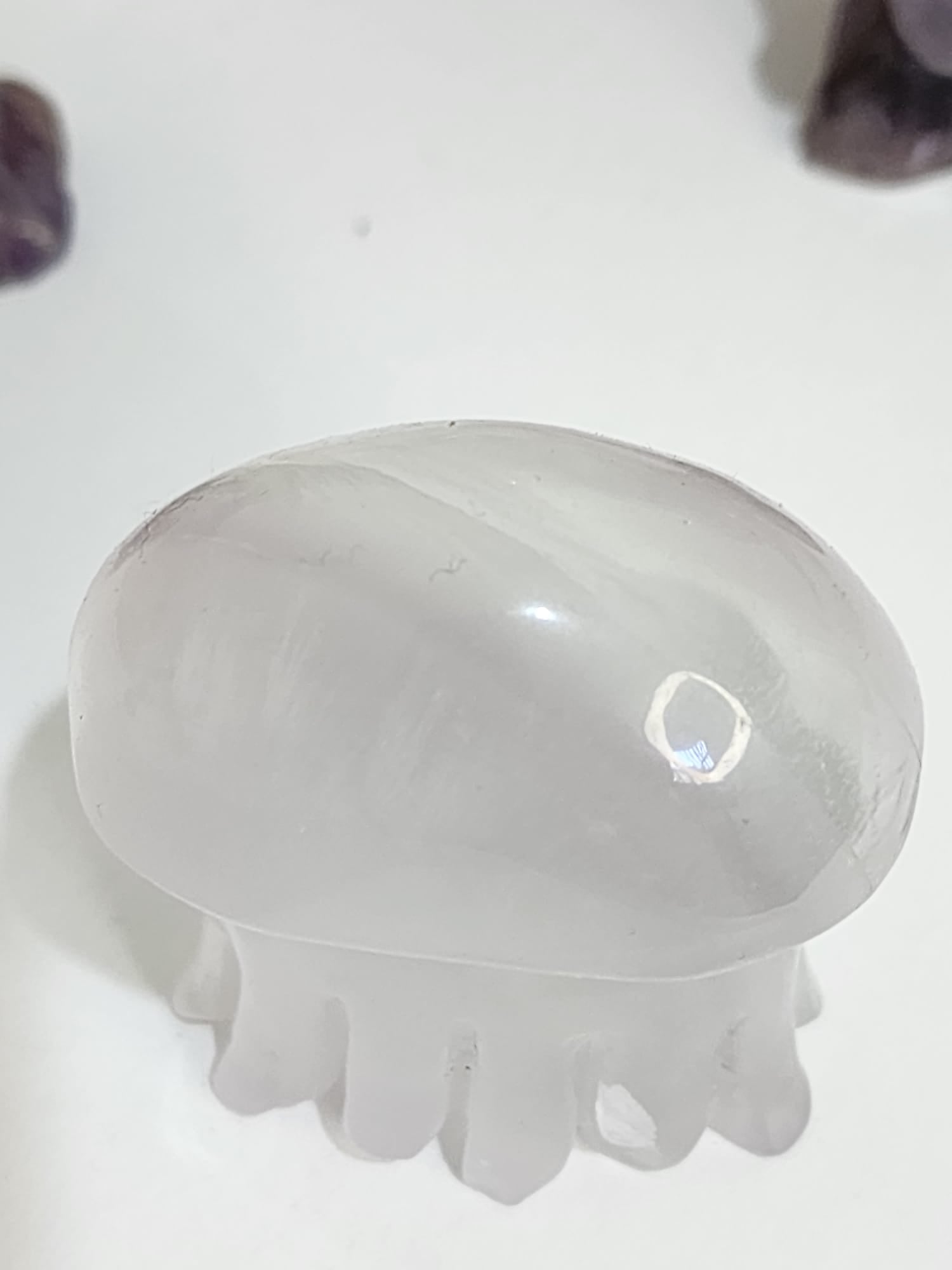 Add a touch of tranquillity to your home with our White Fluorite Jelly Fish figurine. Crafted from stunning white fluorite, this elegant piece will bring a sense of calm and balance to any room. Place it on a windowsill or shelf to catch the light and add a touch of beauty to your space.