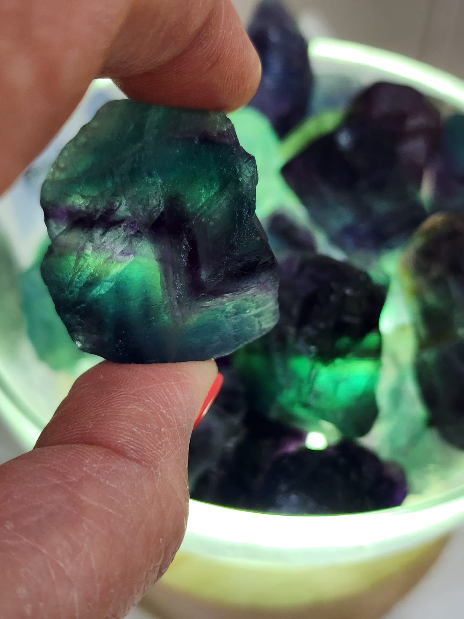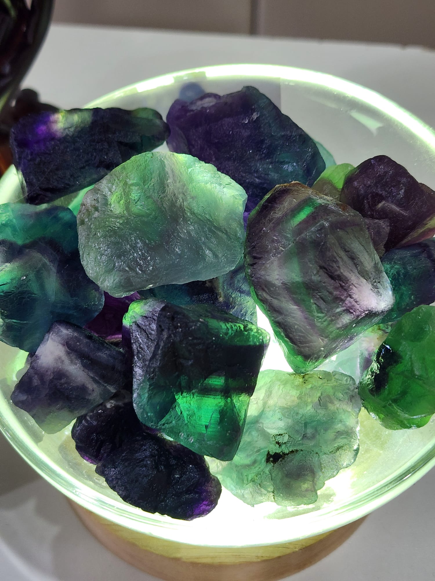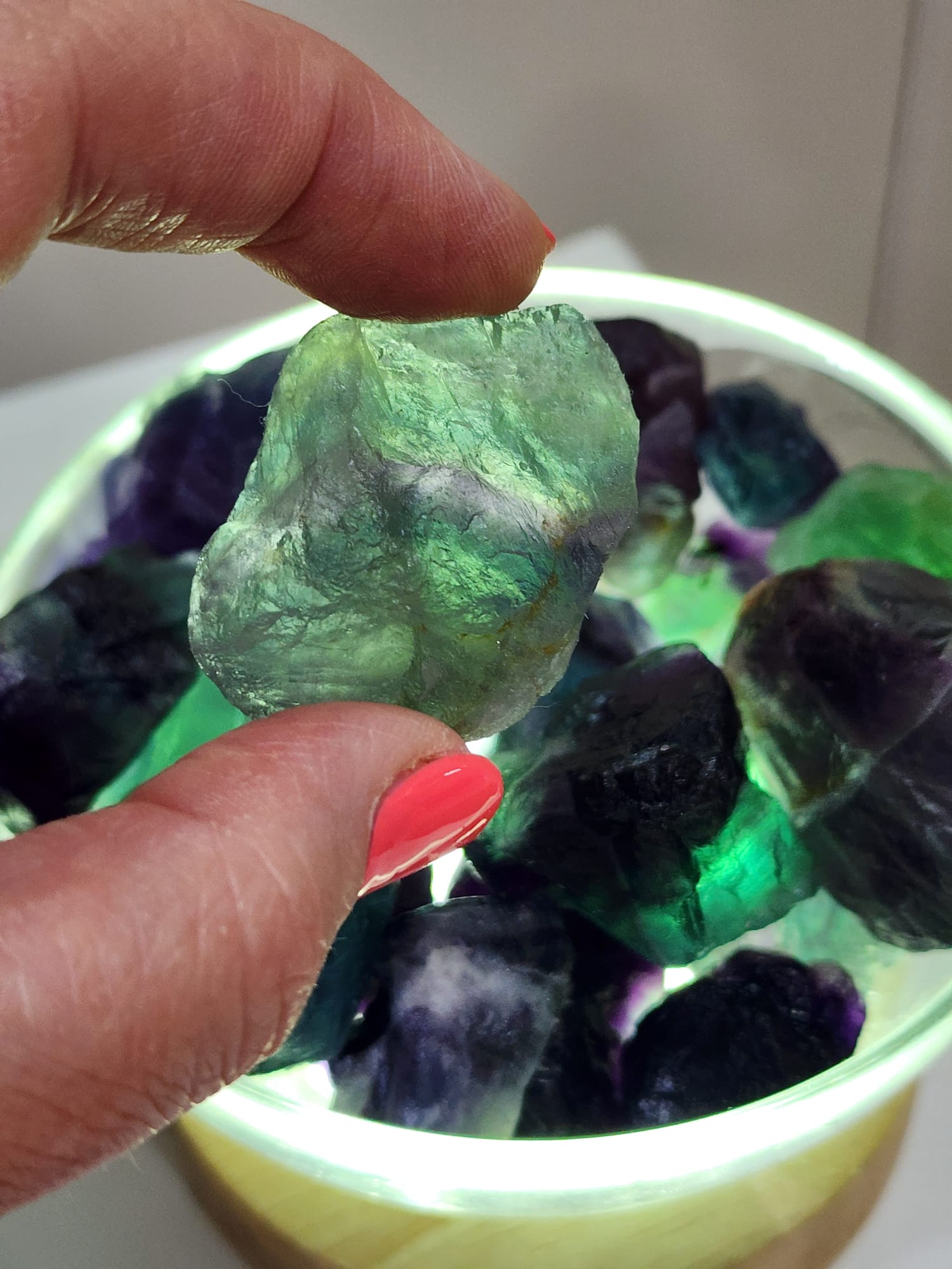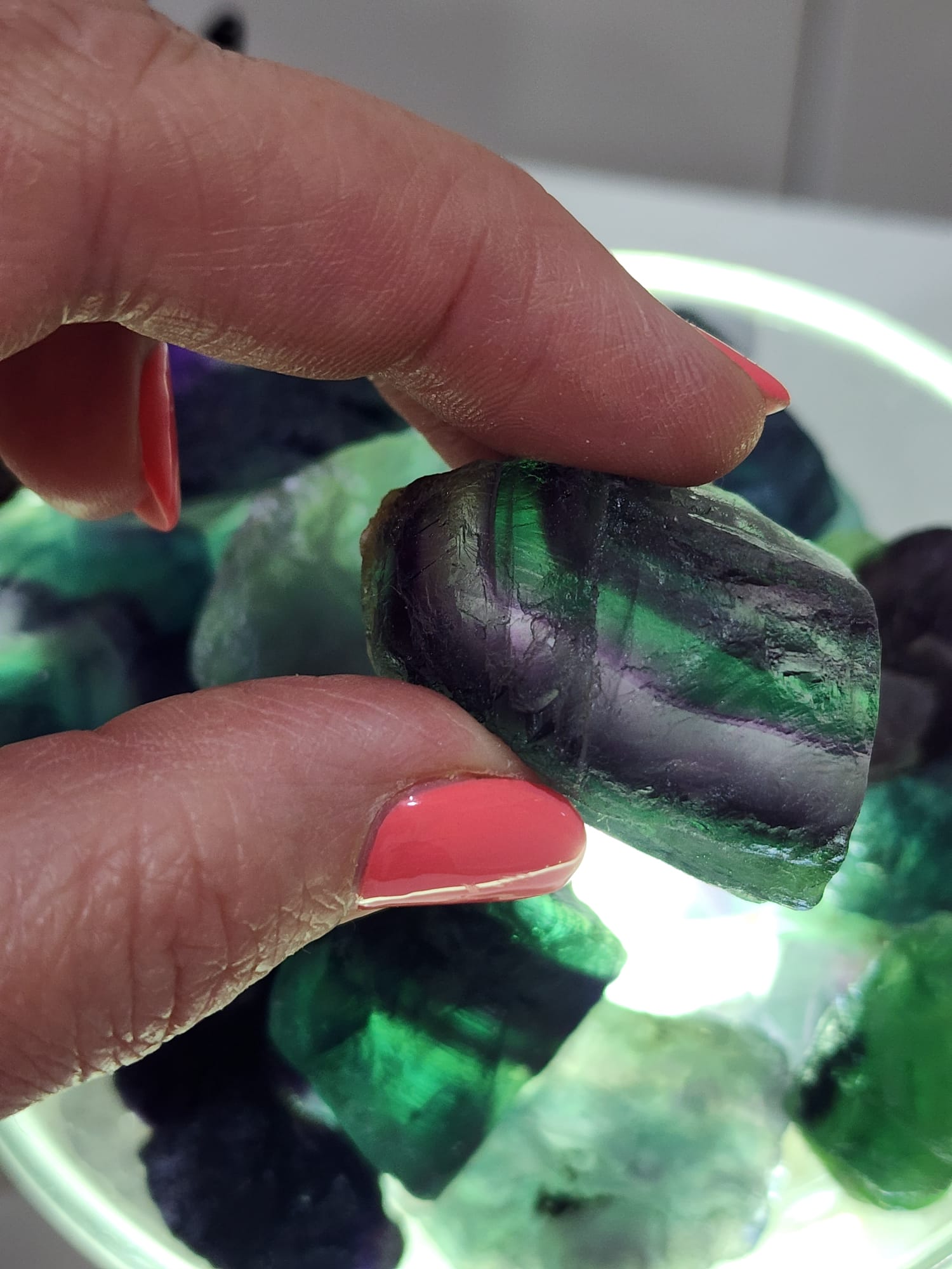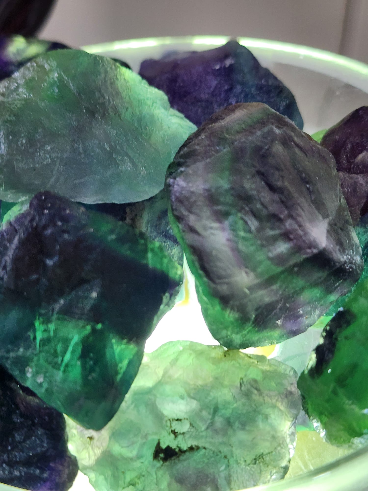 Raw Fluorite pieces are a kaleidoscope of clarity and color—ranging from deep purples and greens to soft blues and even rainbow banding. These unpolished chunks are prized for their ability to enhance focus, clear mental fog, and protect against negative energy. They're especially popular in meditation, study spaces, and crystal grids.