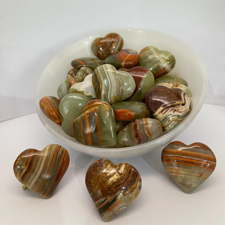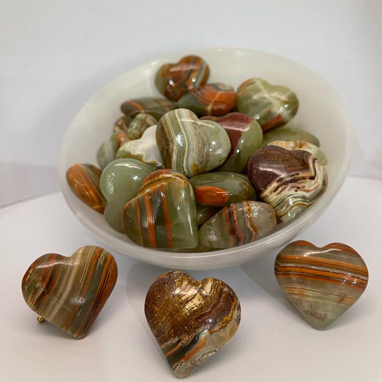 Green Onyx is linked to the heart chakra and the planet Mercury. It is believed to form a connection between the upper and lower chakras. It is said to enhance one's ability to speak publicly and to encourage the open and confident expression of thoughts and feelings.