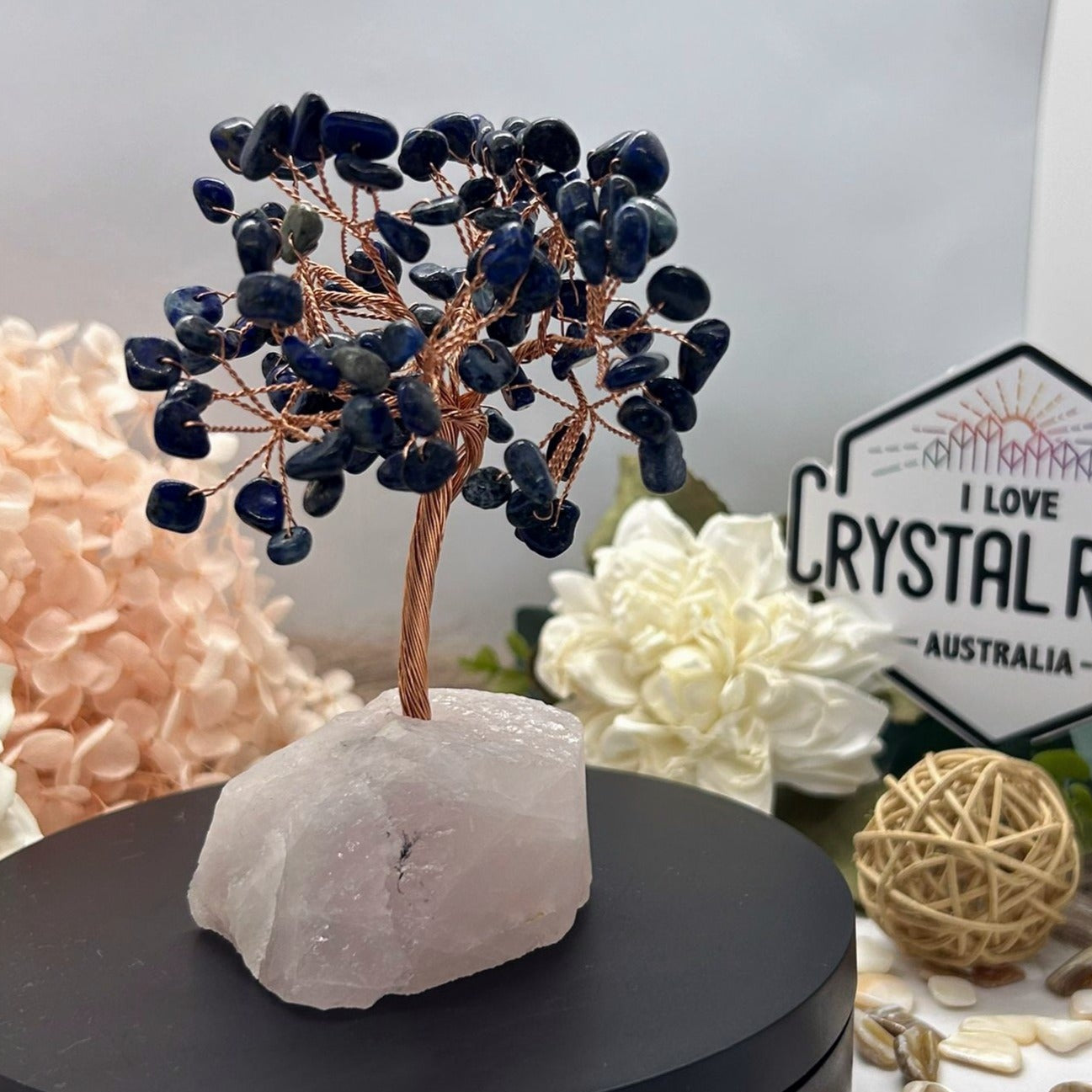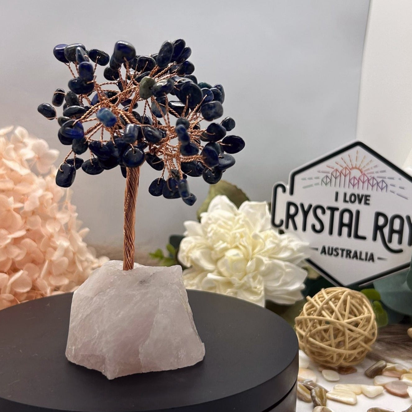 Experience the powerful energy of Lapis Lazuli and the loving vibrations of Rose Quartz with our unique Lapis Lazuli tree on Raw Rose Quartz base. This beautiful piece is the perfect addition to any crystal collection, enhancing your meditation practice and promoting spiritual healing.