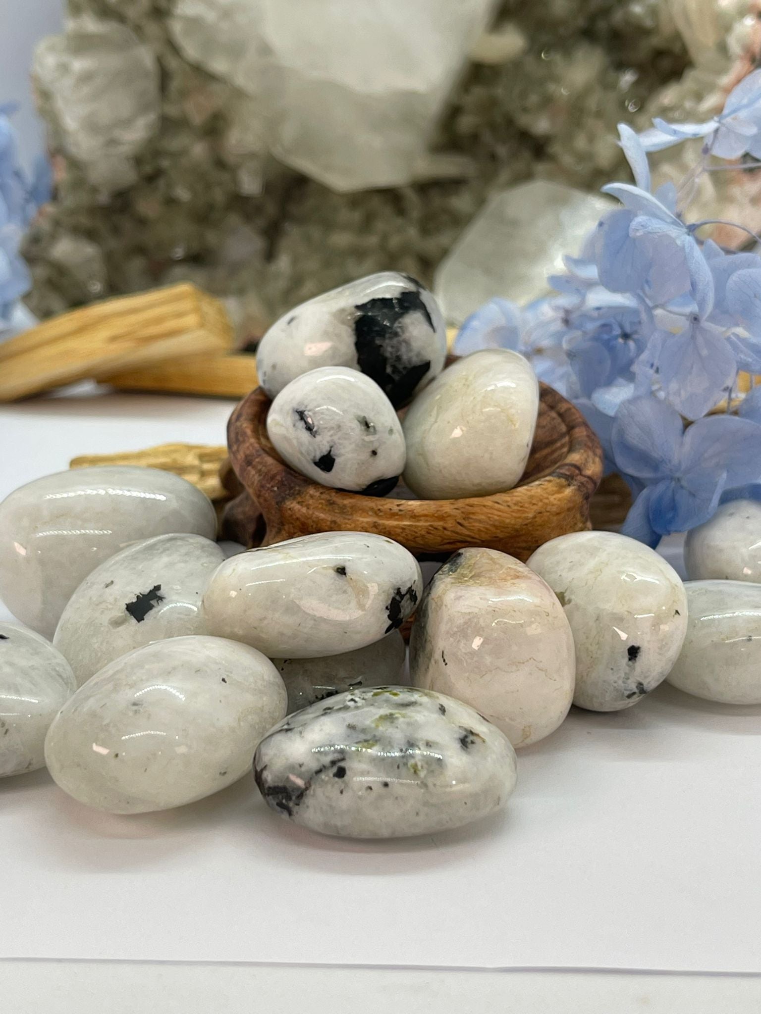 Enhance your energy and intuition with our Rainbow Moonstone Tumble Stones. Known for their calming and balancing properties, these tumbles can help you connect with your inner self and even enhance your psychic abilities. Bring a touch of magic into your life with these beautiful stones.