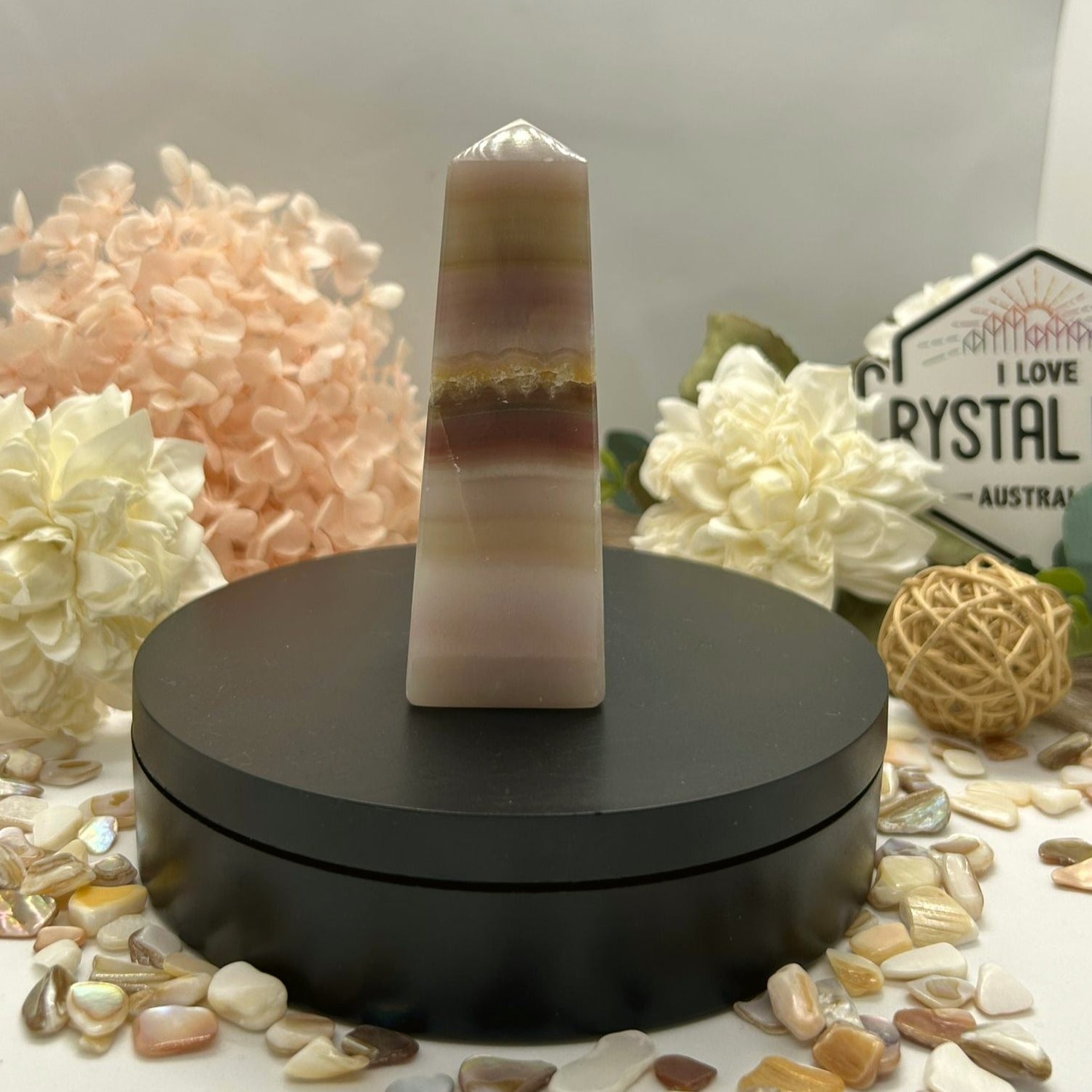 A Pink Banded Onyx Tower is a visually stunning and energetically soothing crystal, known for its gentle hues and layered patterns. Here's everything you need to know: