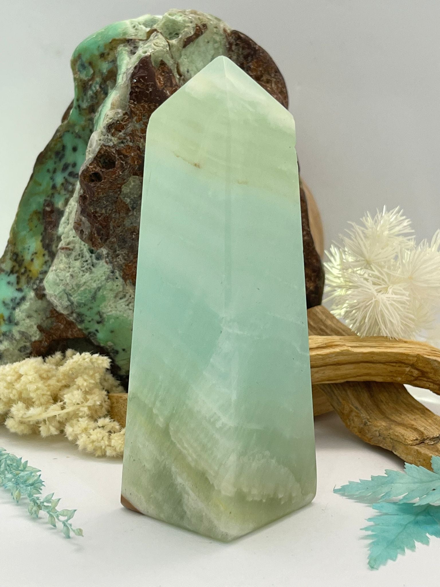 A tower carved from soft, mint‑green serenity. Pistachio Calcite reveals soothing layers of pale green, creamy white, and subtle translucence, creating a naturally calming palette reminiscent of ocean foam and fresh spring air.