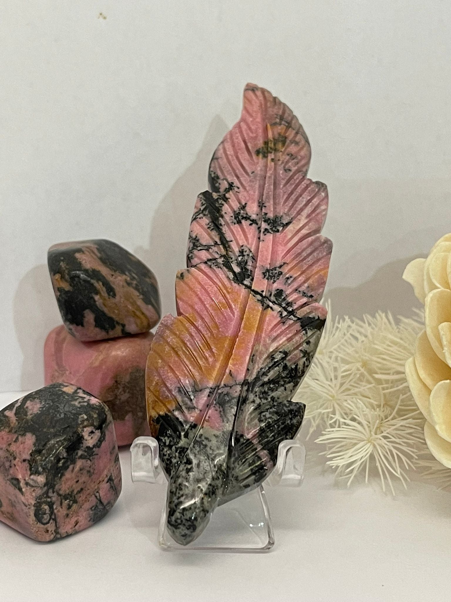 This Rhodonite feather carving is a graceful blend of heart-centred healing and spiritual symbolism. Feathers represent freedom, ascension, and divine connection—so when carved from Rhodonite, they become powerful tools for emotional release and self-love.