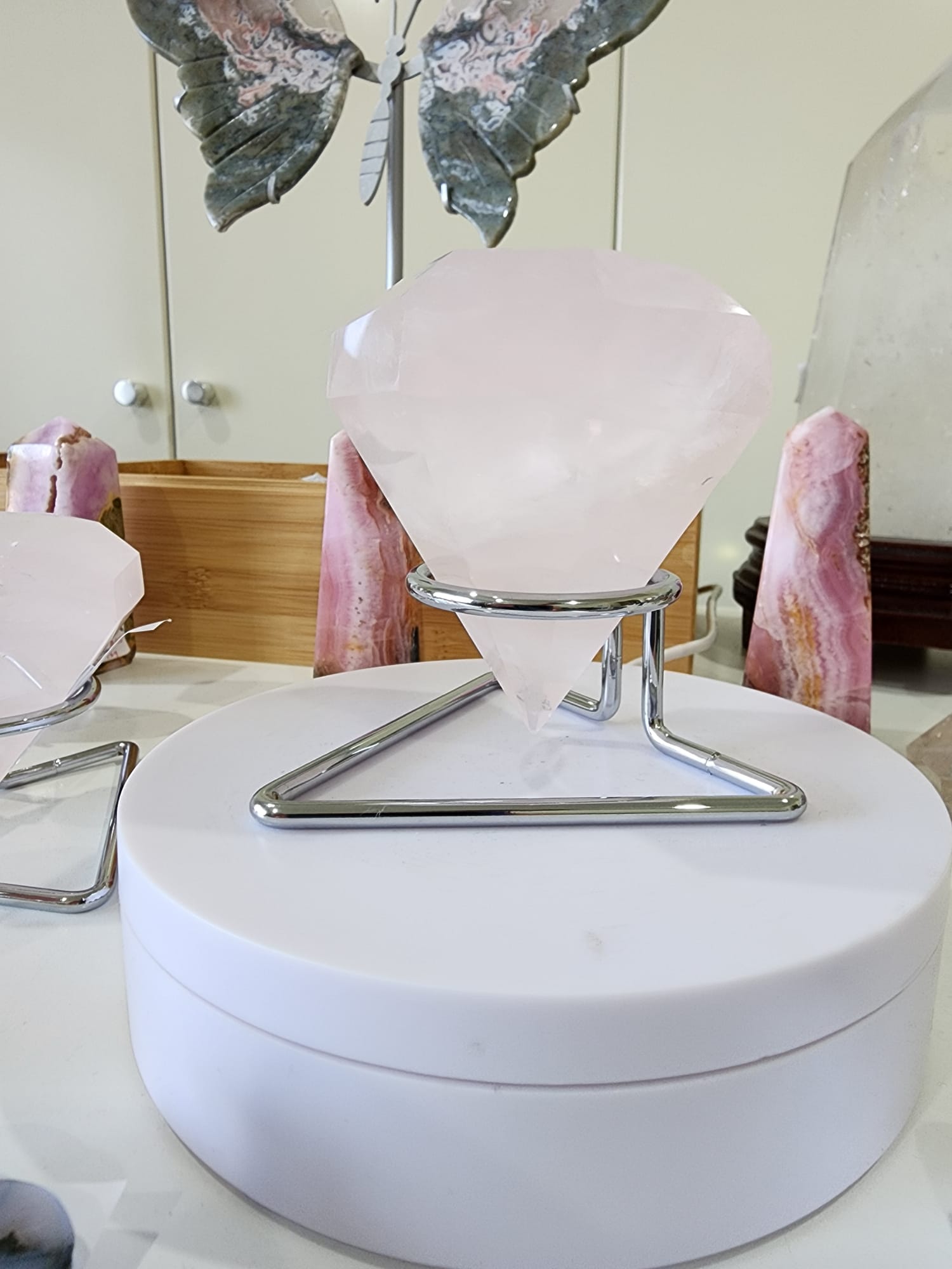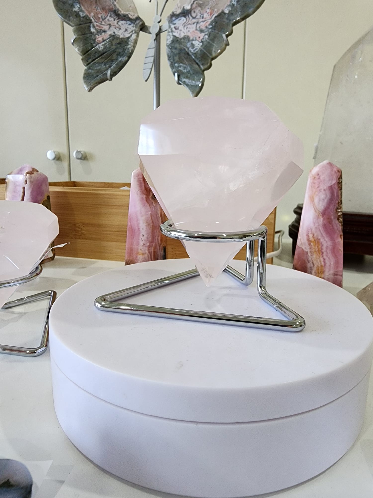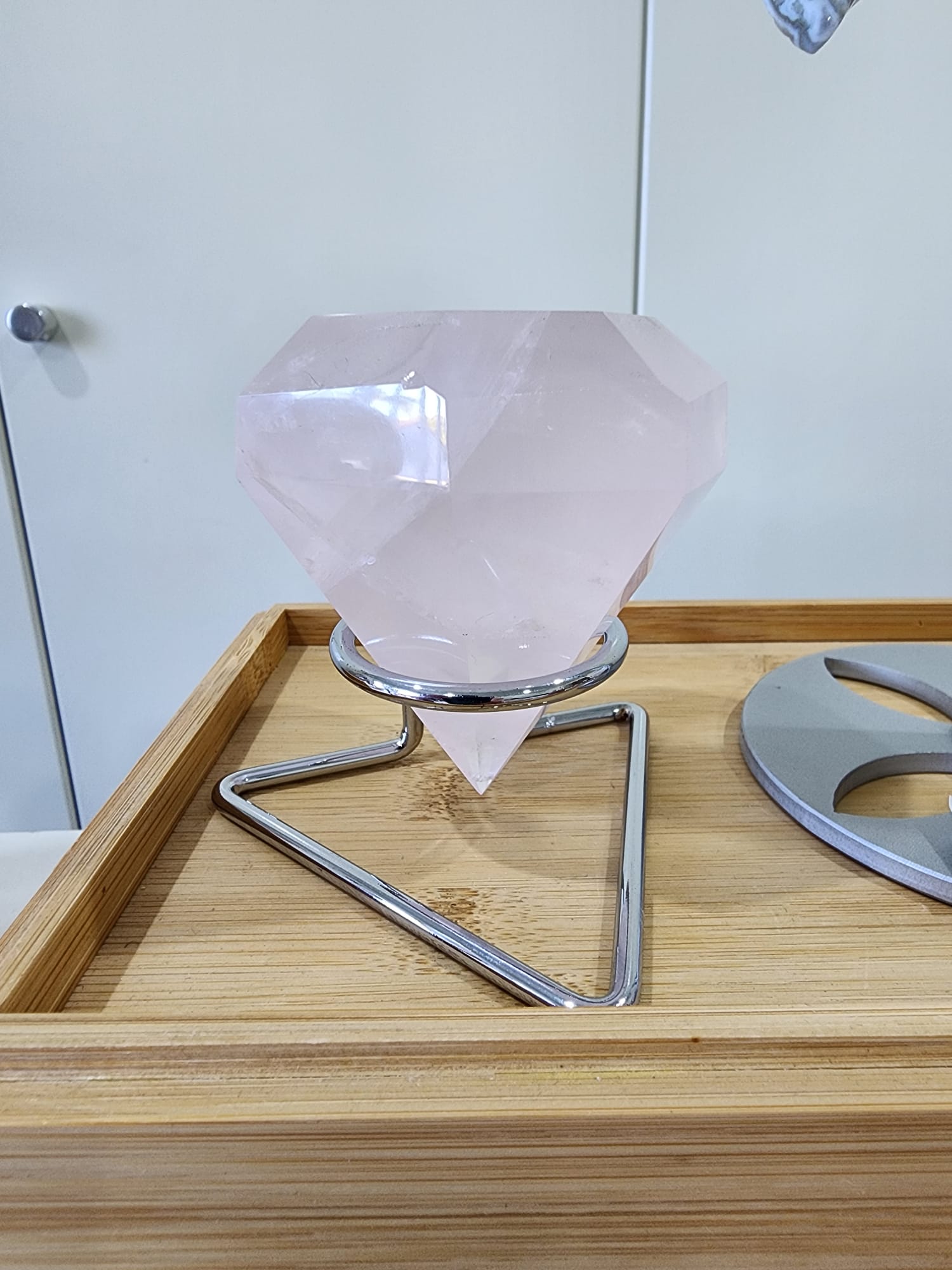 Unleash the inner beauty of your space with our Rose Quartz Diamond! This stunning 388g crystal, delicately displayed on a stand, exudes love and harmony while promoting inner healing. With its calming energy and elegant design, it's the perfect addition to any home or office. Elevate your space with the power of rose quartz.