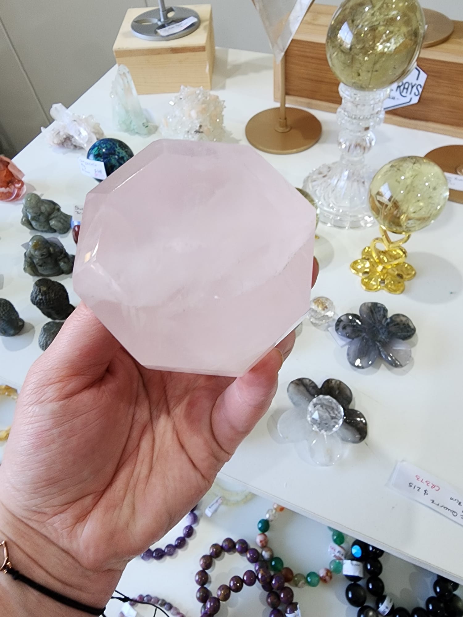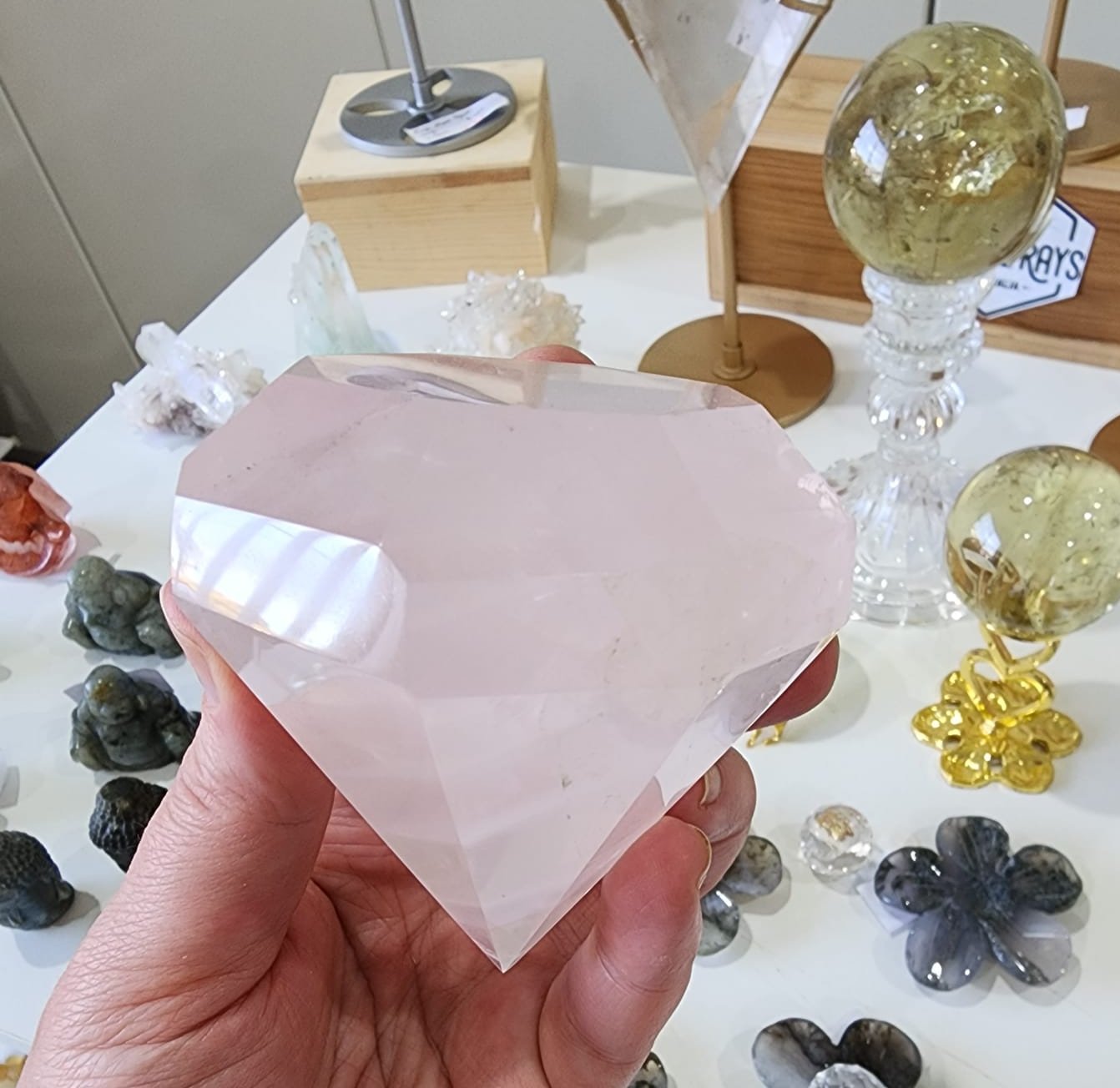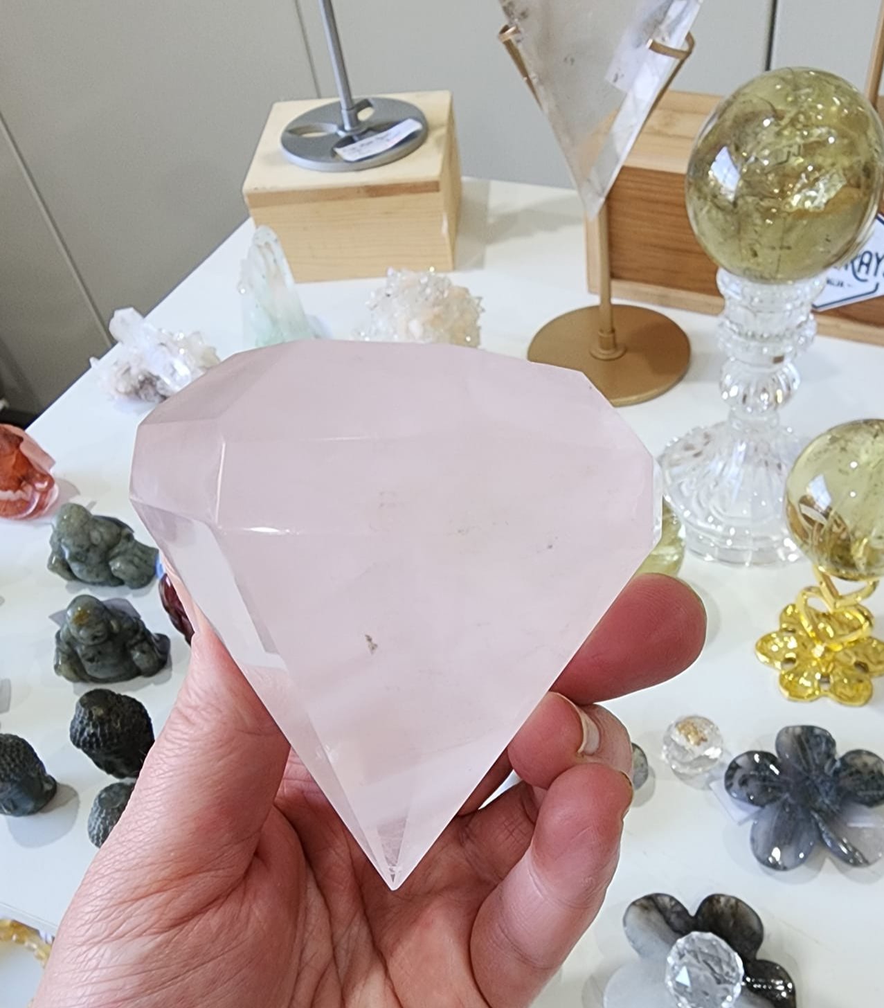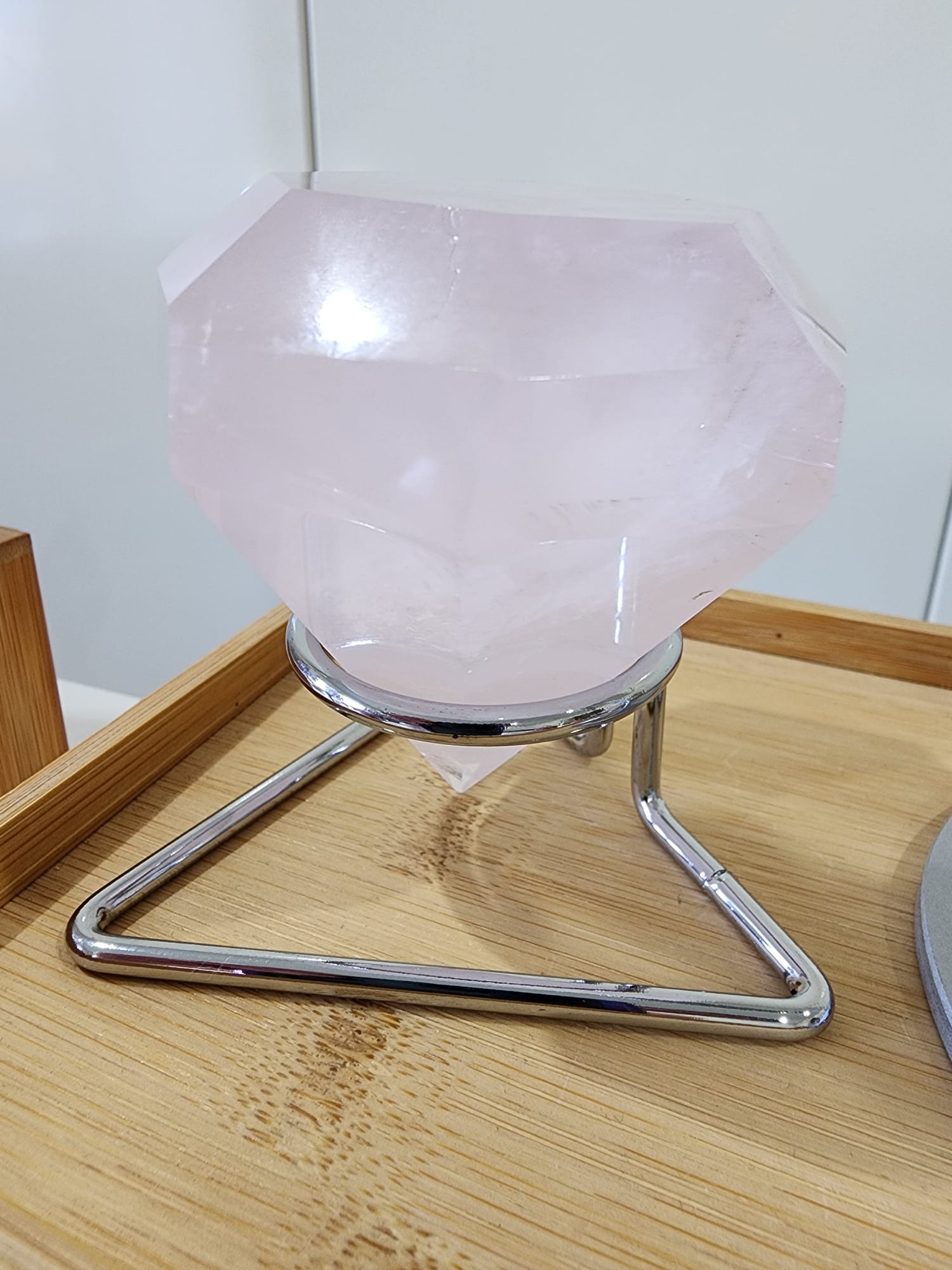 Unleash the inner beauty of your space with our Rose Quartz Diamond! This stunning 388g crystal, delicately displayed on a stand, exudes love and harmony while promoting inner healing. With its calming energy and elegant design, it's the perfect addition to any home or office. Elevate your space with the power of rose quartz.