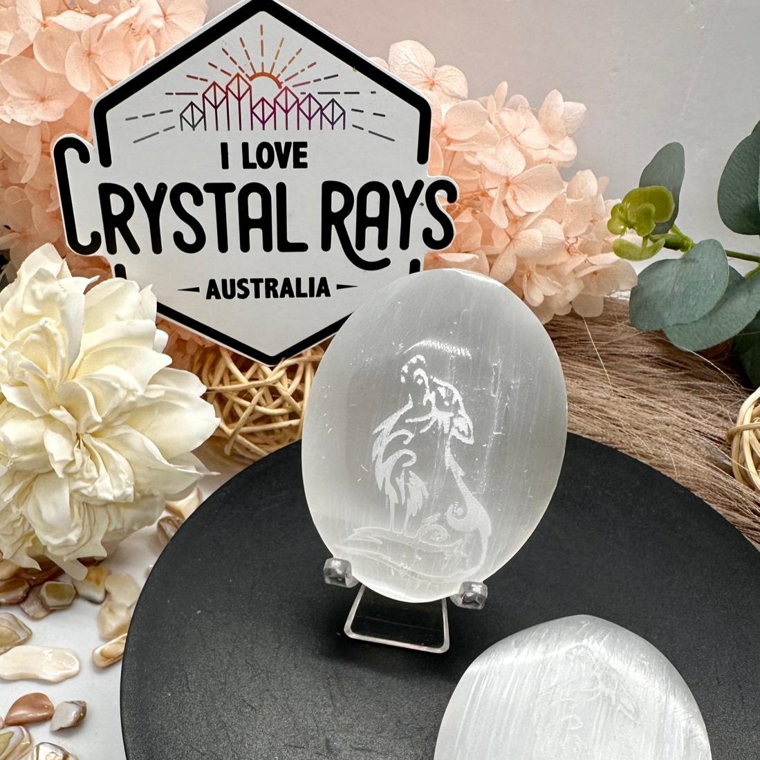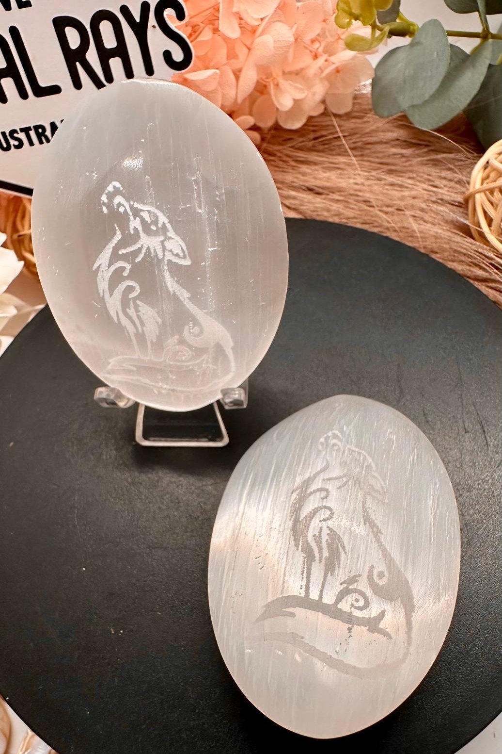 Selenite Palm Stones with Dragon or Wolf engravingššŗš¤.