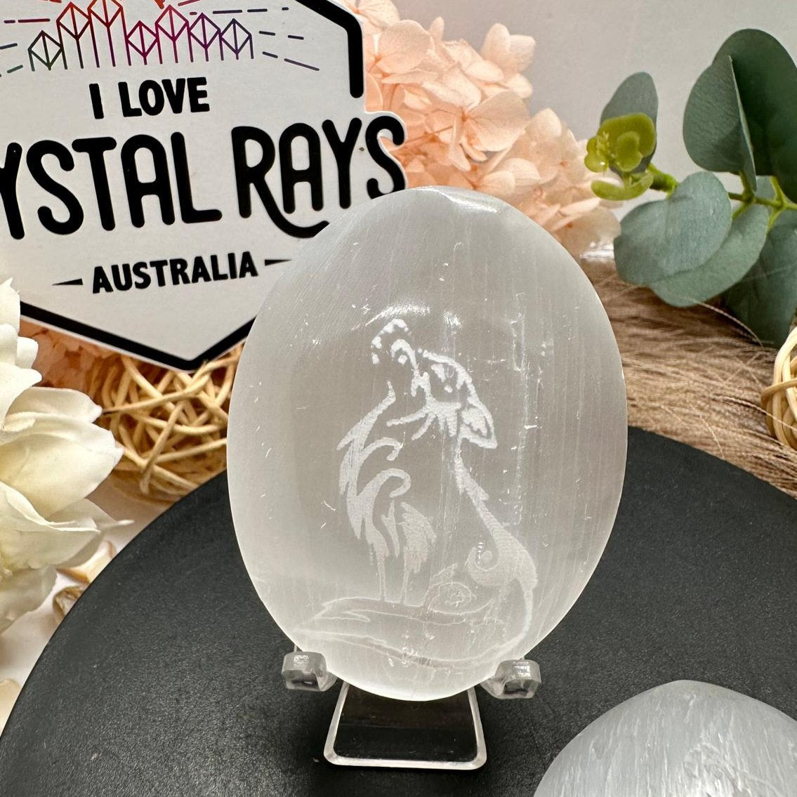 These pieces are absolutely enchanting. The smooth, milky-white Selenite is laser-etched with powerful spirit animal motifsādragons for transformation and strength, wolves for intuition and loyalty.