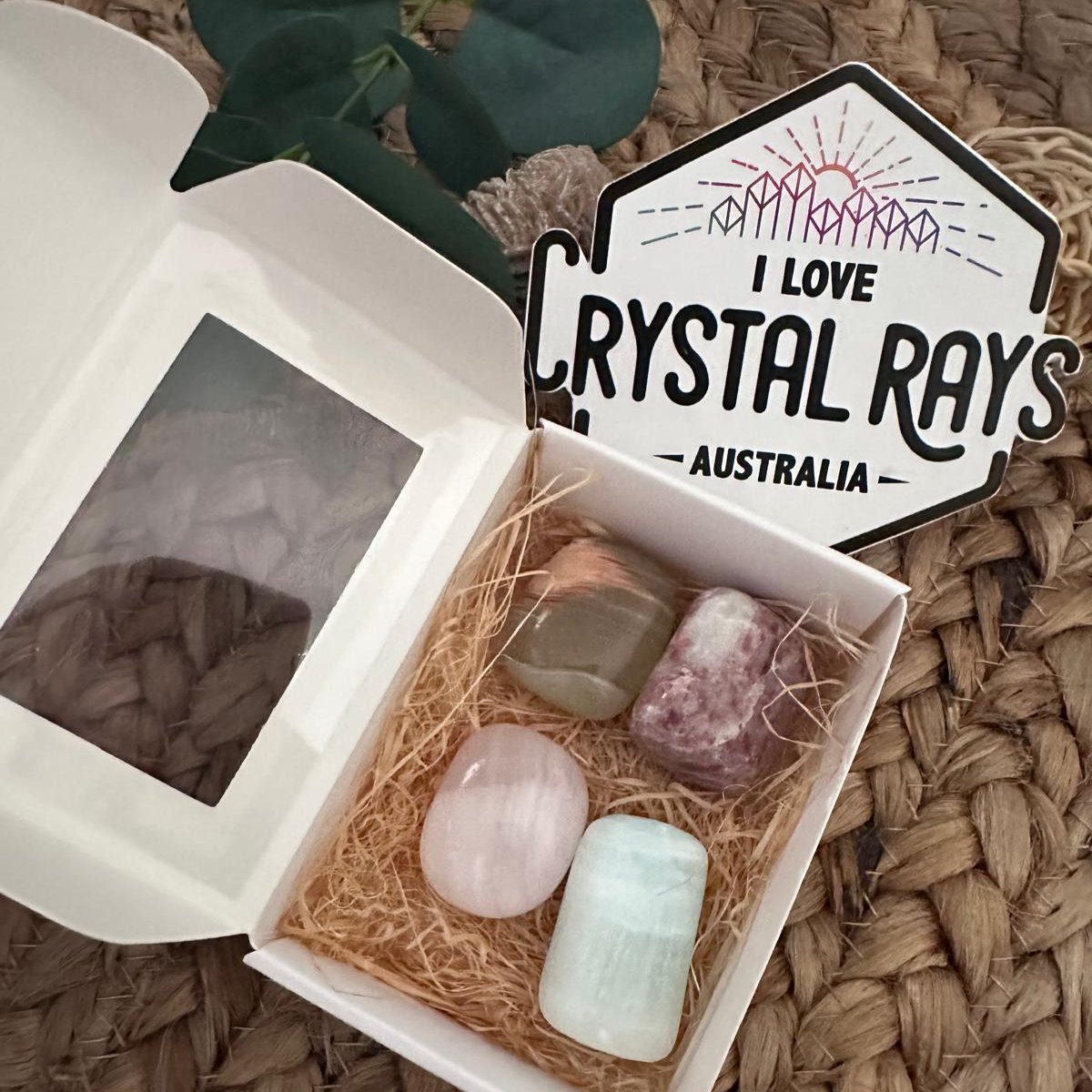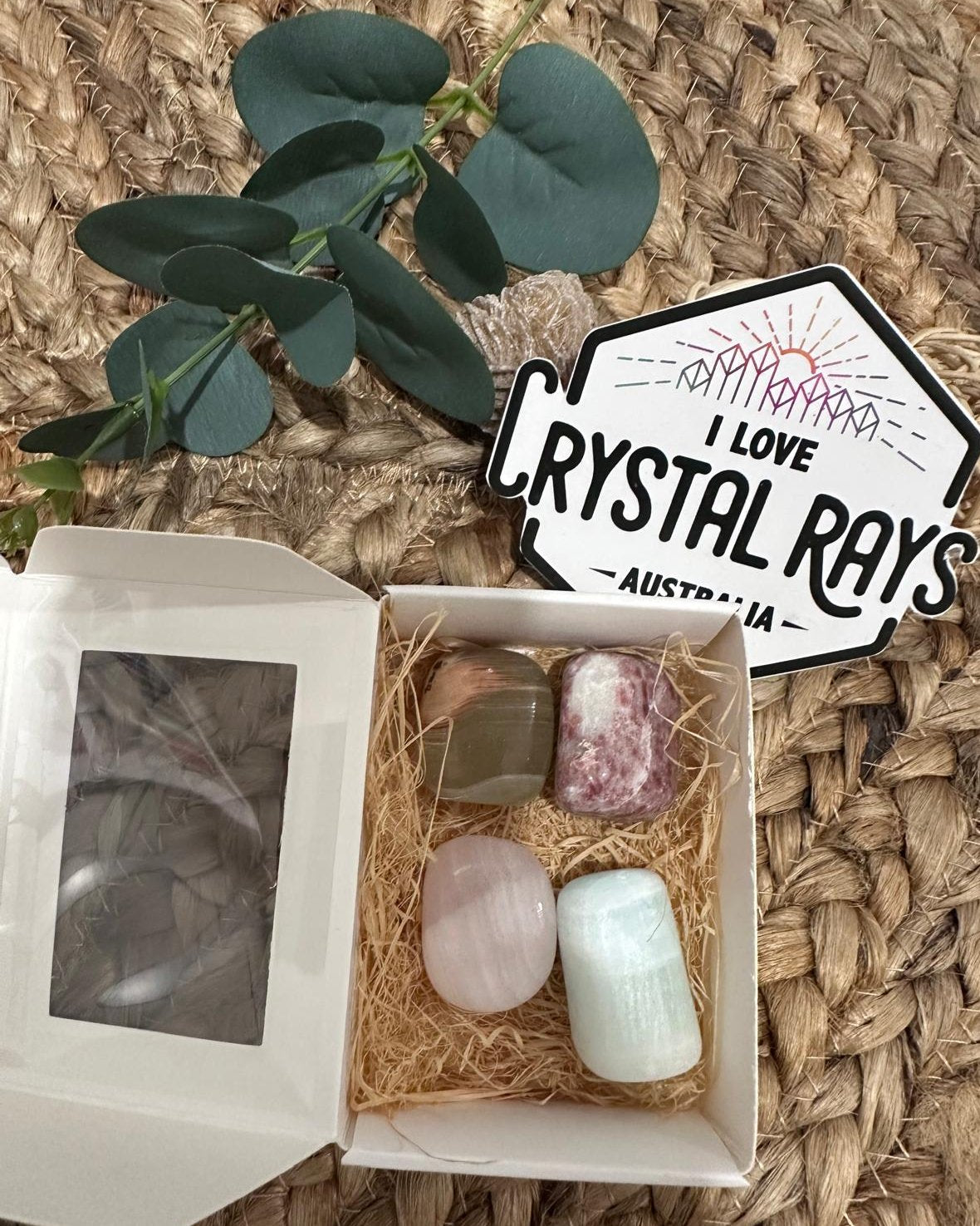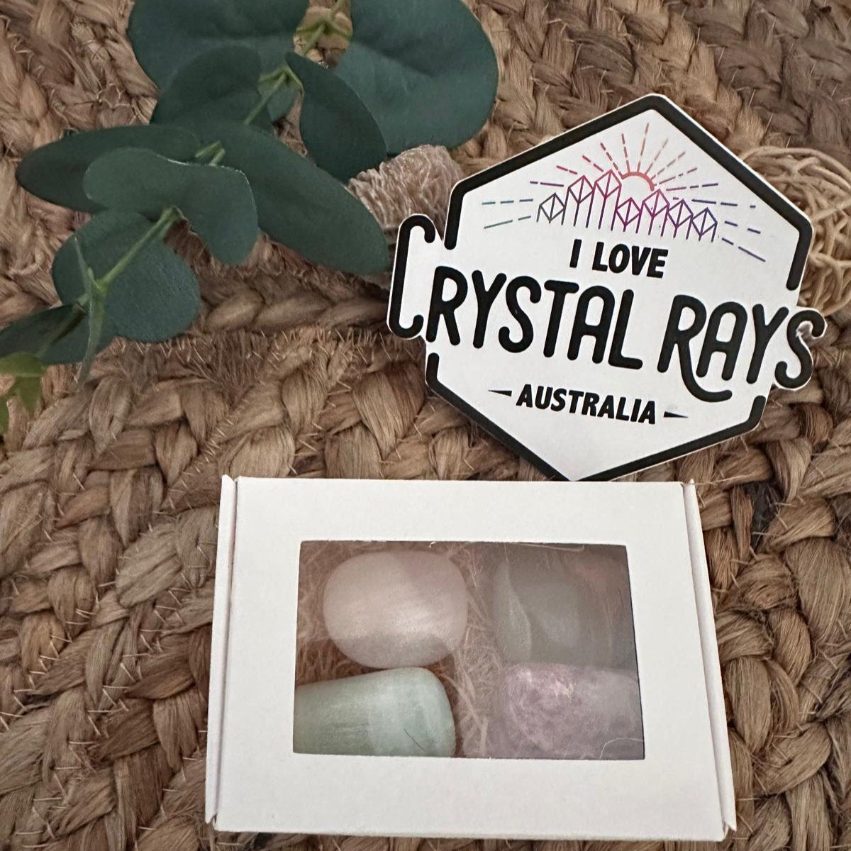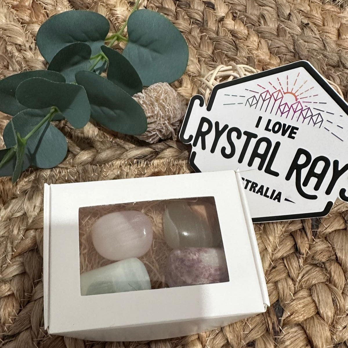 Tumble stone gift sets vary; each set contains four different tumble stones presented in a gift box, with variations in size and type of stone.